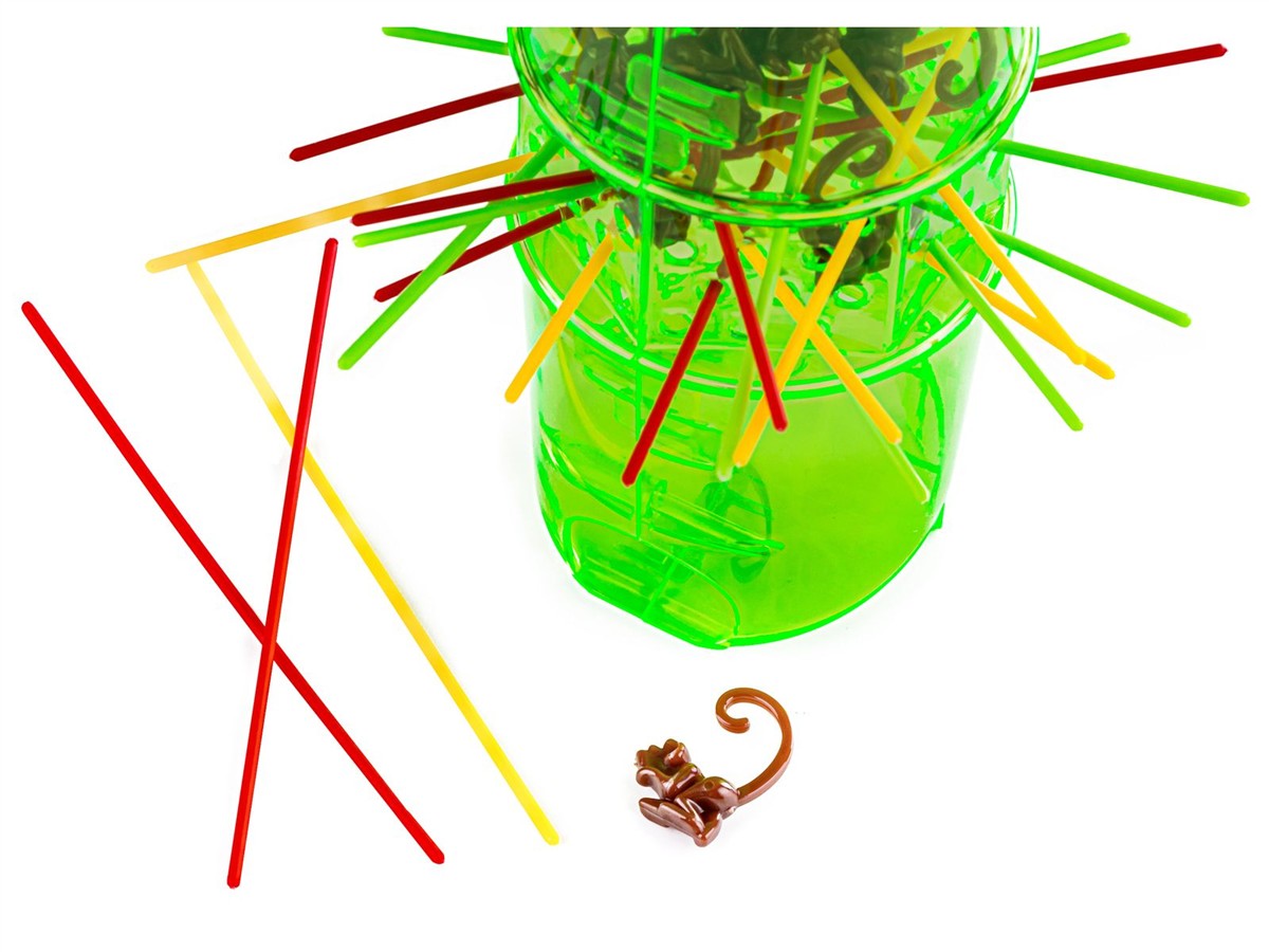 W otwory w naszej wieży układamy gałęzie - kolorowe słomki - po 7 z każdego koloru. Z góry w otwór wieży, wrzucamy wszystkie małpy tak, aby zawisły na gałęziach/bierkach. Jeżeli któraś małpka spadnie na podstawę, podnosimy ją i wrzucamy od góry aż wszystkie będą wisiały na gałęziach. Po rozpoczęciu gry, każdy gracz po kolei ostrożnie wyciąga słomkę w dowolnym kolorze. Małpki, które spadną na sam dół, gracz kładzie przed sobą. Na koniec gry podliczamy nasze naczelne. Wygrywa osoba, która strąciła z wieży najmniej małpek.