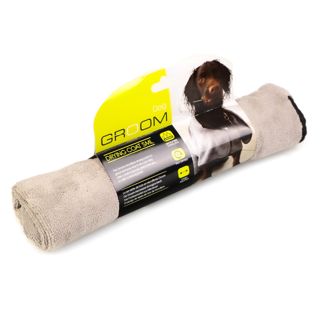 Płaszcz z mikrofibry Groom to świetny i łatwy sposób na osuszenie psa po spacerze w deszczu, kąpieli w morzu lub po relaksującej kąpieli. Wystarczy zapiąć i wyregulować paski na rzepy, zetrzeć nadmiar wody i pozostawić na sobie, aby mikrofibra wchłonęła pozostałą wilgoć z pupila.
