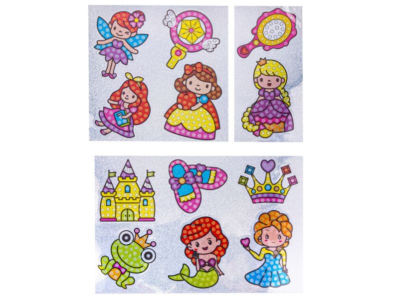 Oferowany zestaw zawiera wszystkie niezbędne elementy do wykonania gotowych układanek w tematyce księżniczek :) Zabawa polega na tym aby odpowiednimi, bajecznie kolorowymi diamencikami wyłożyć pola na naklejkach.