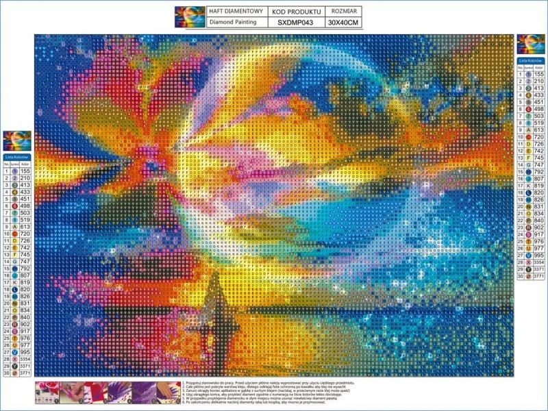 Oferowany zestaw zawiera wszystkie niezbędne elementy do wykonania gotowej układanki. Zabawa polega na tym aby odpowiednimi diamencikami wyłożyć ponumerowane płótno - tworząc w ten sposób dzieło sztuki - obraz.