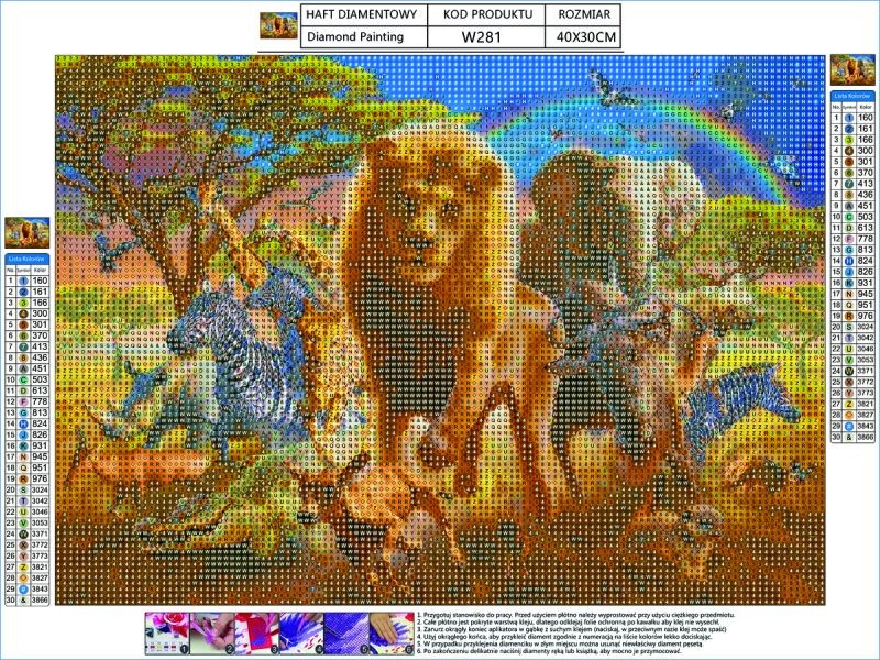 Oferowany zestaw zawiera wszystkie niezbędne elementy do wykonania gotowej układanki. Zabawa polega na tym aby odpowiednimi diamencikami wyłożyć ponumerowane płótno - tworząc w ten sposób dzieło sztuki - obraz.
