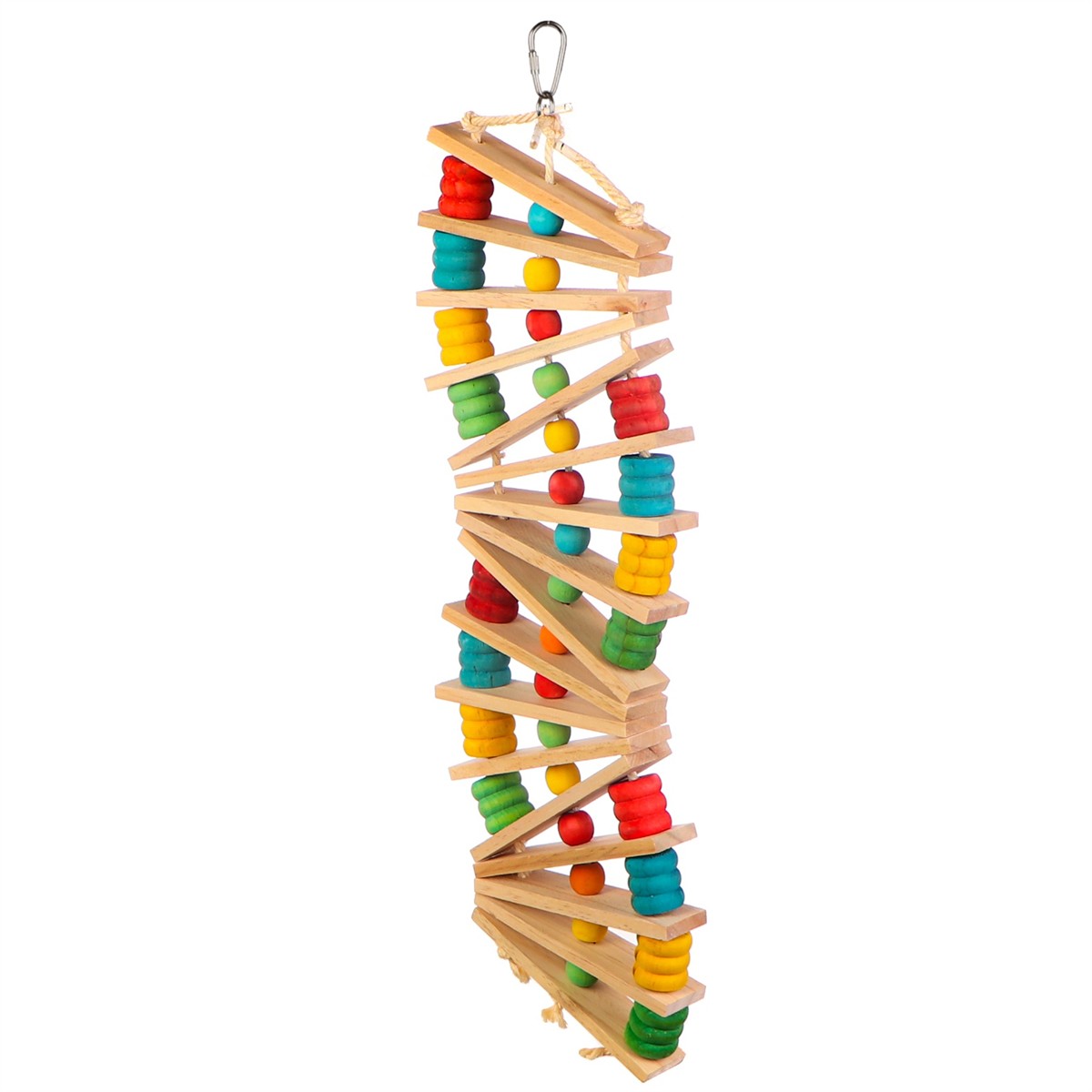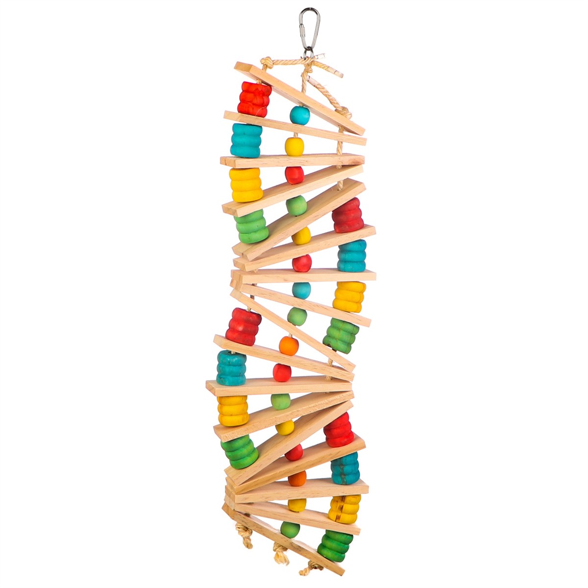 Zabawka składa się z drewnianych elementów połączonych sznurkiem między którymi znajdują się kolorowe drewniane koraliki. Po środku znajdują się słupki przypominając drabinkę do wspinania, zabawy. Papużka dzięki zabawce będzie spędzać dni aktywnie, nie nudząc się w klatce.
