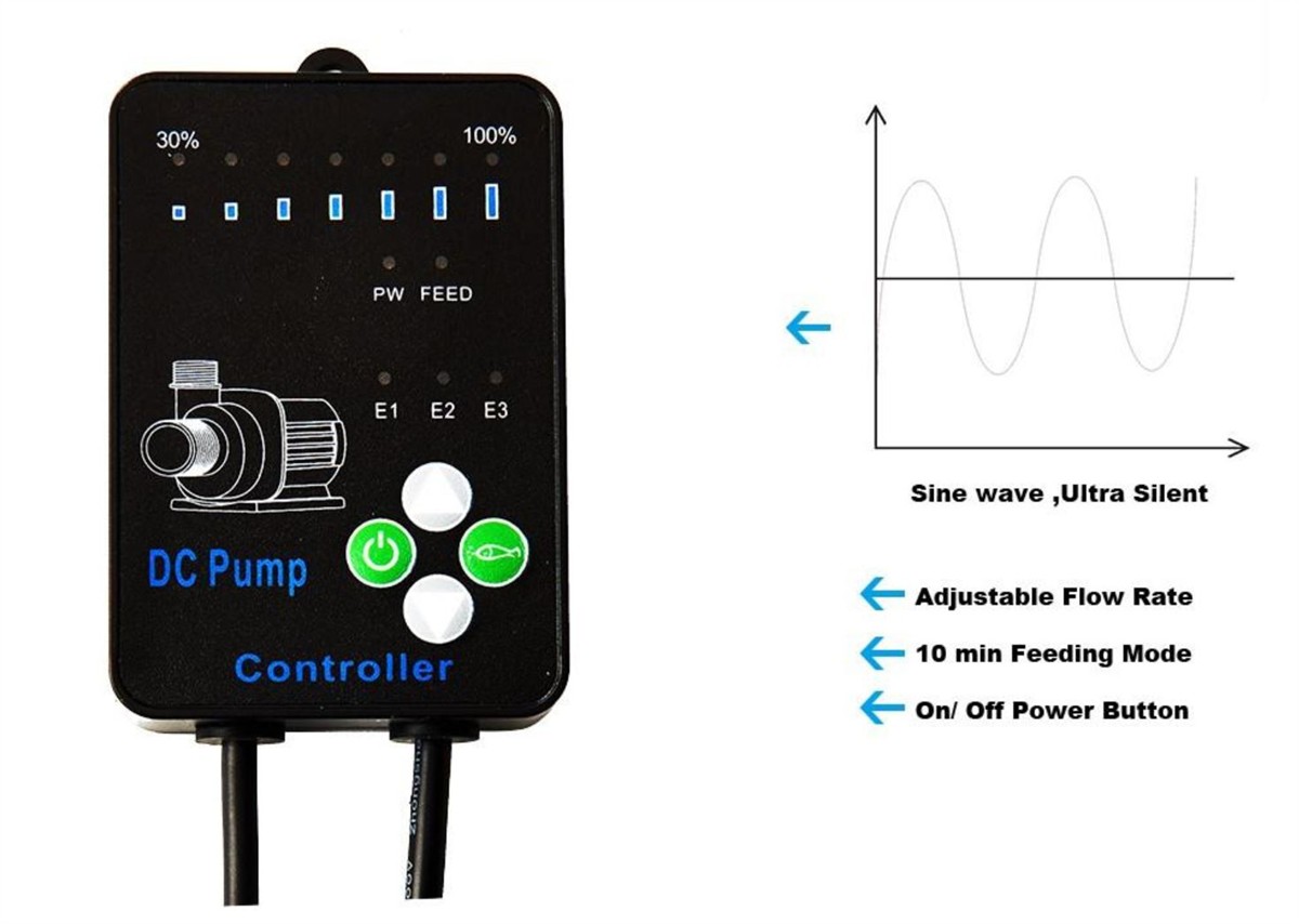Każda pompa SWD posiada bardzo czytelny i prosty w obsłudze kontroler. Dzięki temu urządzeniu można płynnie sterować mocą pompy od 30% do 100% mocy, włączyć/wyłączyć pompę lub nastawić 10'cio minutową przerwę na czas karmienia.