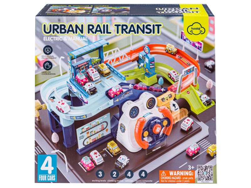 Super zjazdTen tor samochodowy na pewno przyciągnie uwagę Twojego dziecka. Aby wciągnąć samochodzik na górę należy użyć wciągarki. Może ona być sterowana ręcznie za pomocą pokrętła / korbki lub jeśli posiadamy baterie to automatycznie. Do podjazdu montujemy wtedy kierownicę zasilaną 3 bateriami 1,5V AA (brak baterii w zestawie). Uruchomienie podjazdu odbywa się za pomocą dźwigni zmiany biegów. Kierownica posiada również przycisk odpowiedzialny za klakson (środkowy) oraz dwa kierunkowskazy. Jeden z nich (lewy) odpowiedzialny jest za nazwy różnych pojazdów oraz odgłosy jakie wydają (nazwy w języku angielskim). Prawy uruchamia kilka wesołych melodyjek. | ![]() |