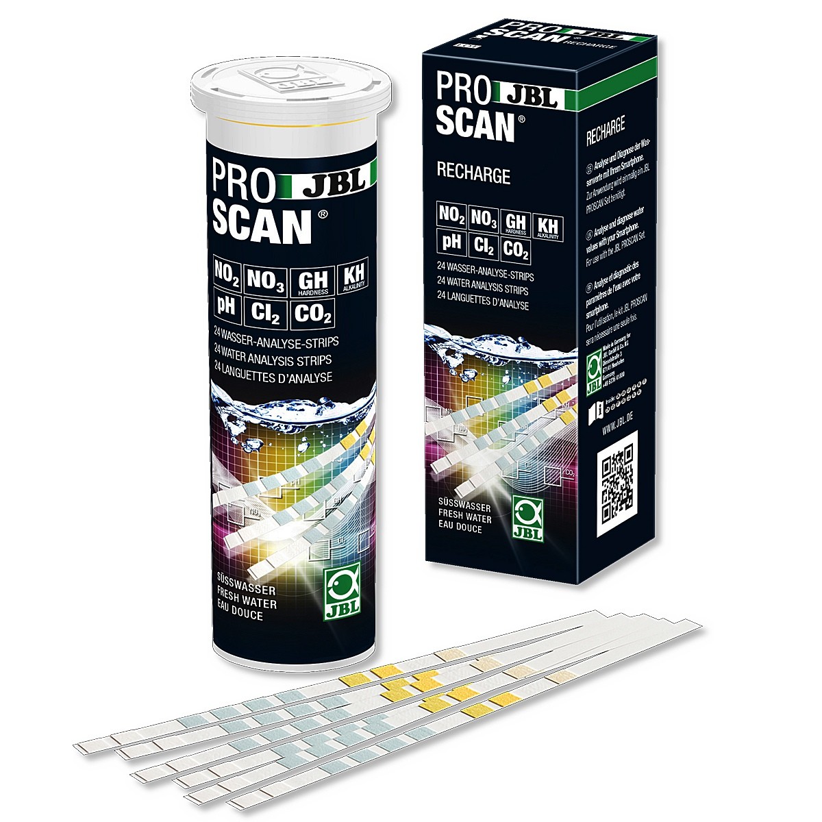 Opakowanie: 24 paski do analizy wody. NIE zawiera wzornika kolorów – do interpretacji wyników niezbędna jest aplikacja mobilna JBL ProScan.
