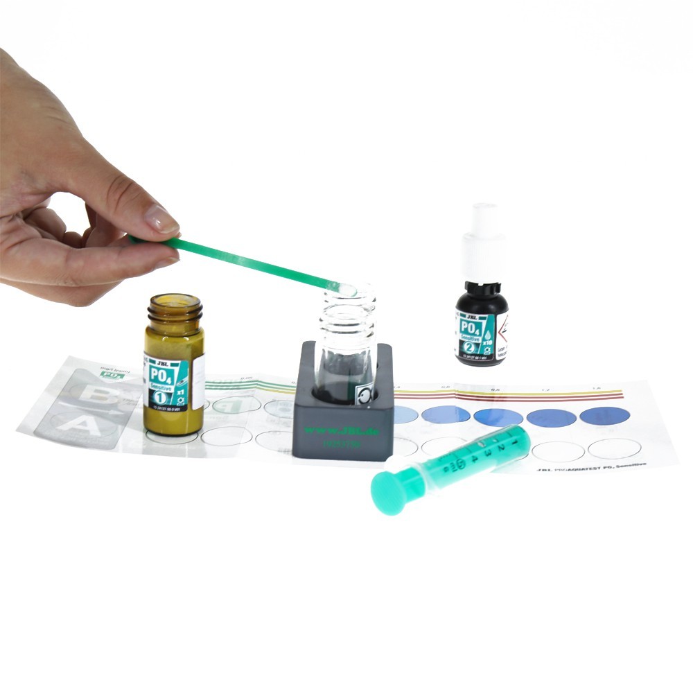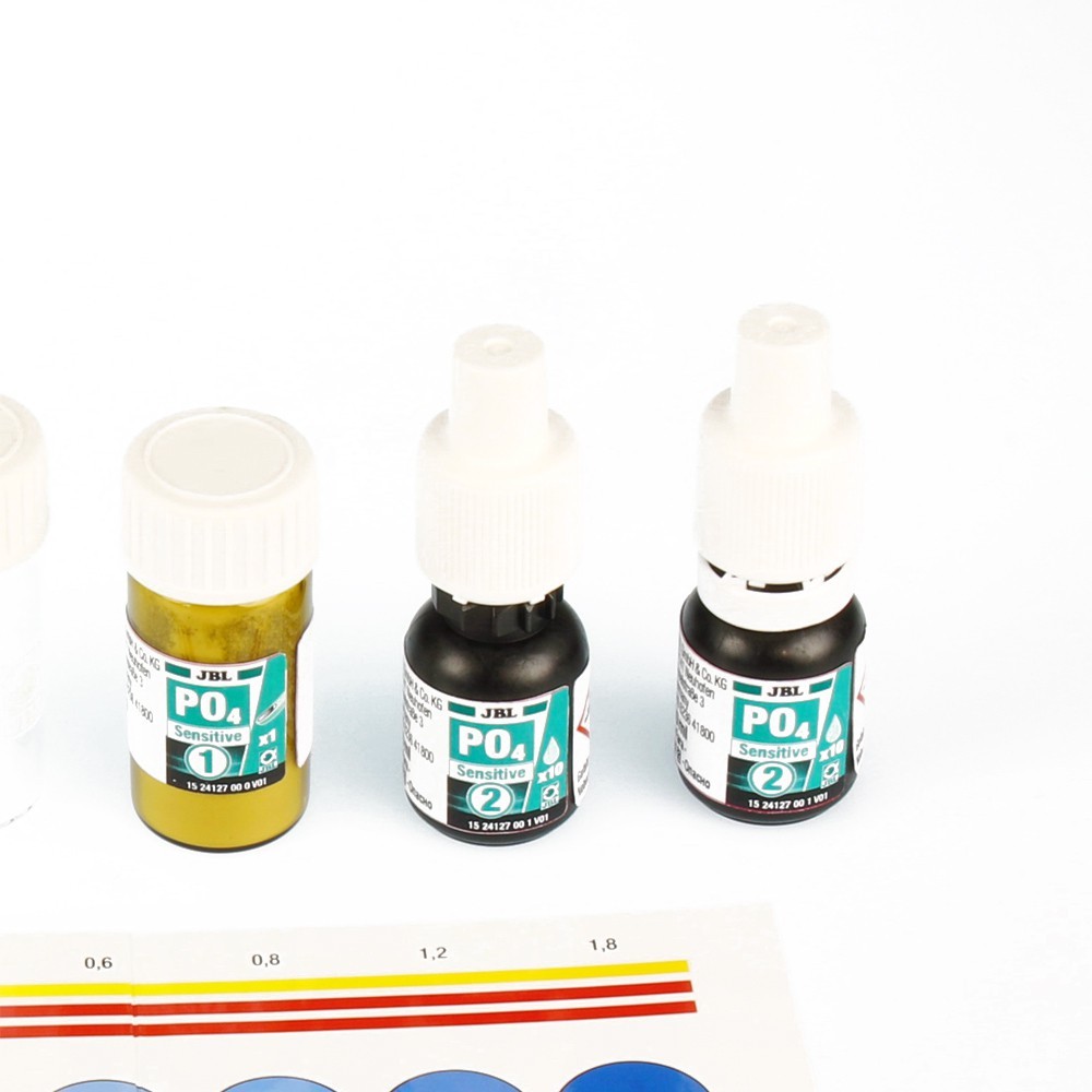 Test pozwalający na zbadanie stężenia fosforanów (PO4) w wodzie akwariowej. Niezbędny w przypadku nawożenia zbionika różnego rodzaju nawozami. Duże stężenia fosforanów mogą być niebezpieczne dla ryb, a jego nadmiar prowadzi do niekontrolowanego wzrostu glonów. Na podstawie wskazań testu jesteśmy w stanie dobrać odpowiednie dawki nawozów w celu zrównoważenia makroelementów w wodzie. Prowadzić to będzie do ustabilizowania zbiornika, a tym samym do pozbycia się glonów.