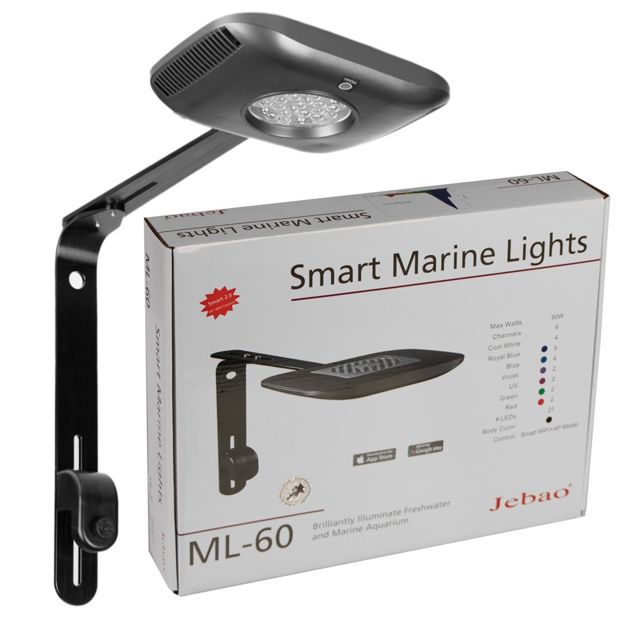 Lampa Jebao ML-60 doskonale imituje światło naturalne dla ryb, koralowców i innych stworzeń morskich. Lampa zawiera 6 kanałów kolorystycznych diod LED w tym białe, niebieskie, fioletowe, a także diody w kolorze zielonym i czerwonym. Jasność oraz efekty oświetleniowe każdego z kanałów LED można ustawić indywidualnie i kontrolować za pomocą aplikacji, dzięki czemu bez trudu odwzorujesz warunki niczym na dnie morza.