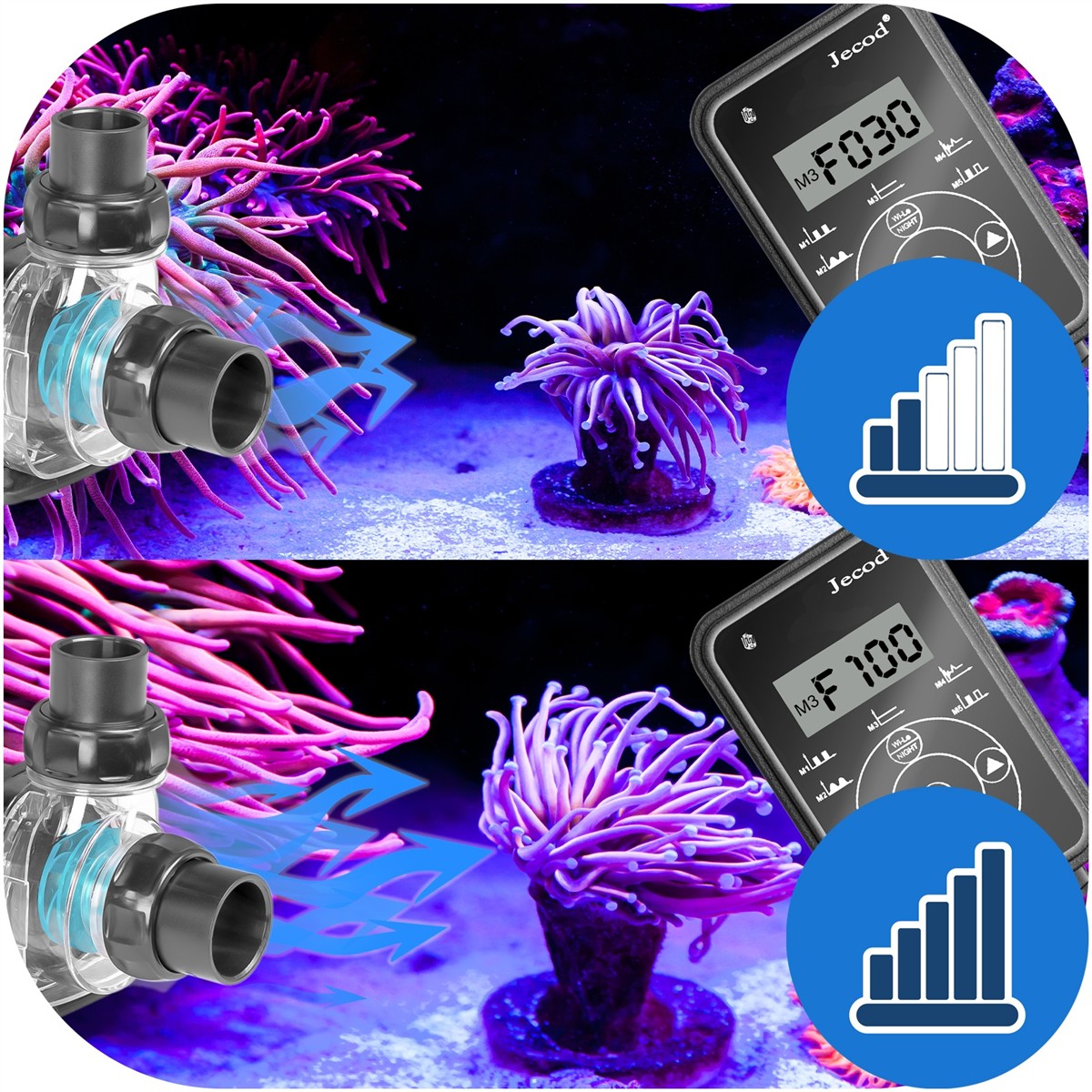 Pompa wody obiegowa do akwarium morskiego - słonowodnego. Pompa z regulacją mocy - przepływu, osią ceramiczną i trybami falowania. Zaawansowany pilot umożliwia sterowanie mocą od 30% do 100%, posiada wybór różnego trybu działania, w tym falowania mocy.