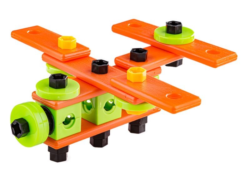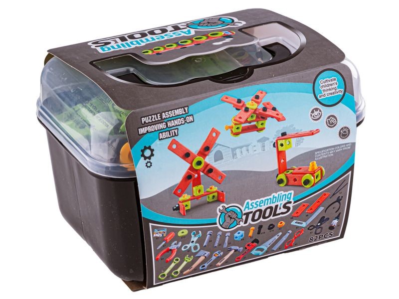 Zestaw elementów konstrukcyjnych w zestawie z kuferkiem i wieloma narzędziami przypadnie do gustu każdemu małemu majsterkowiczowi.