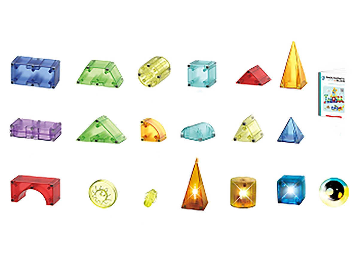 Zestaw zawiera również obrazkową instrukcję z przykładowymi układami i pokazuje jak je krok po kroku budować.