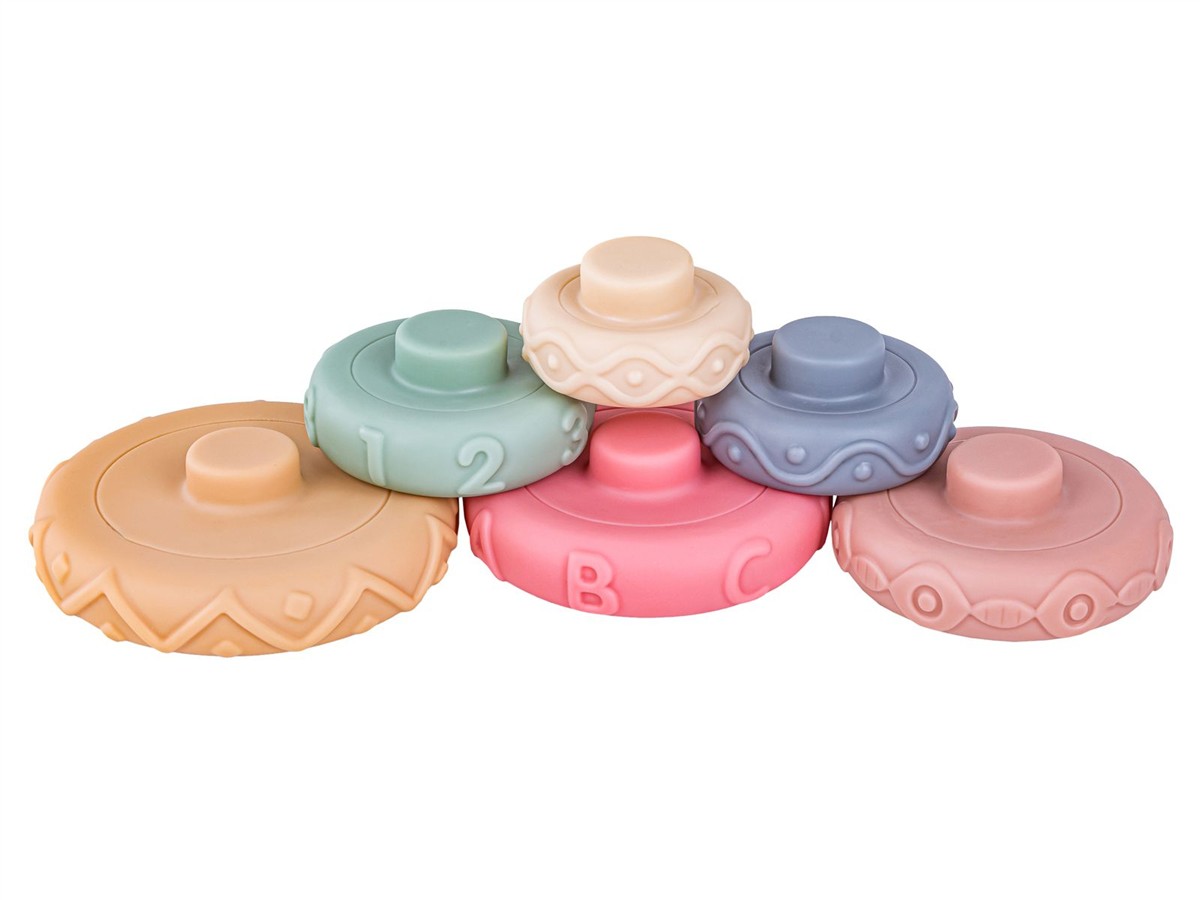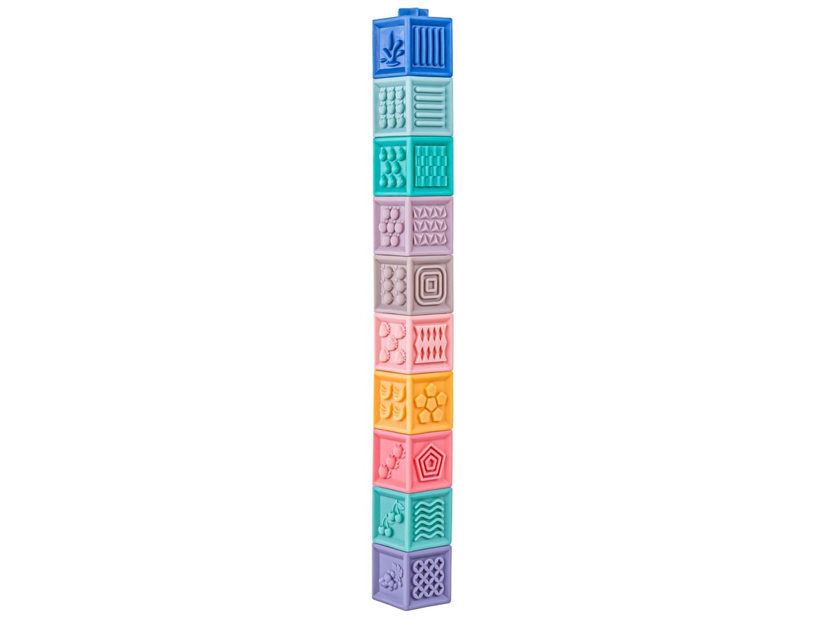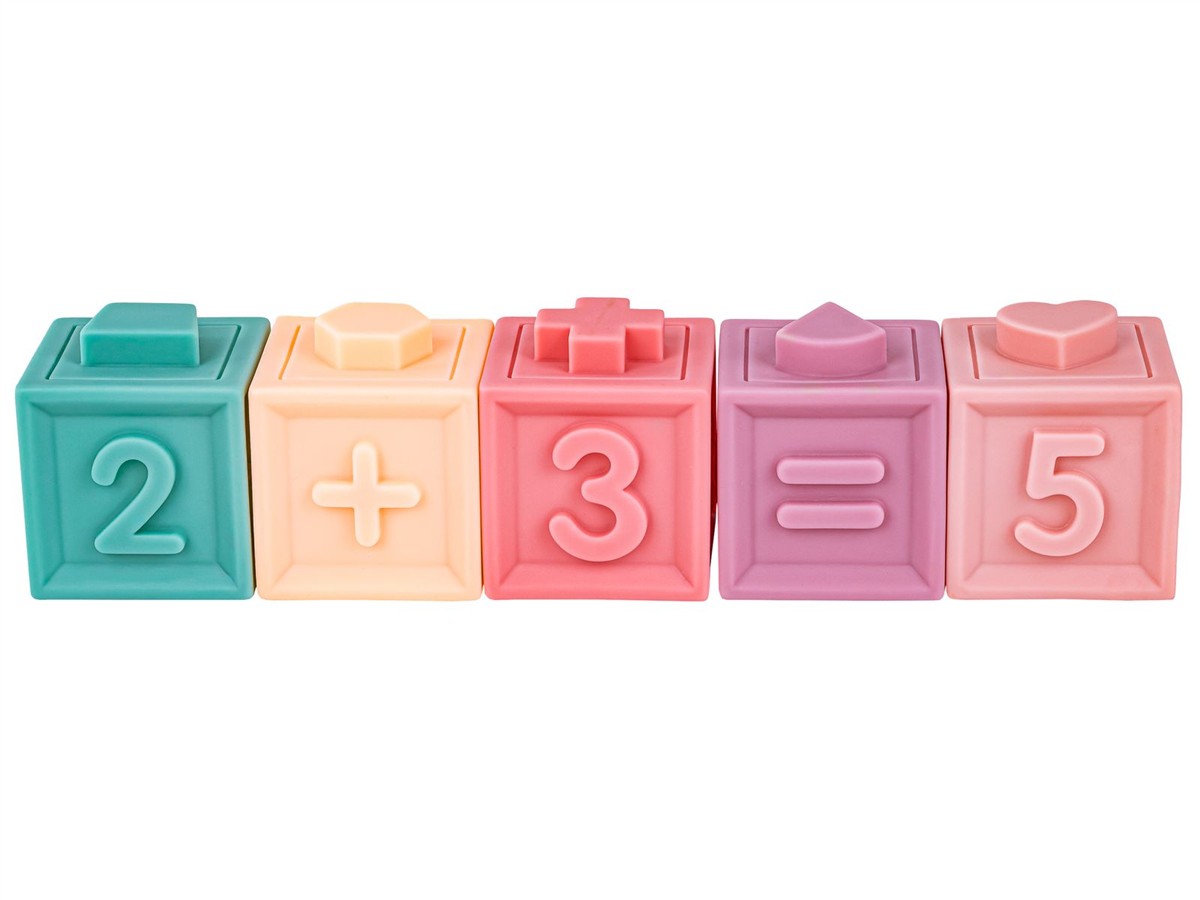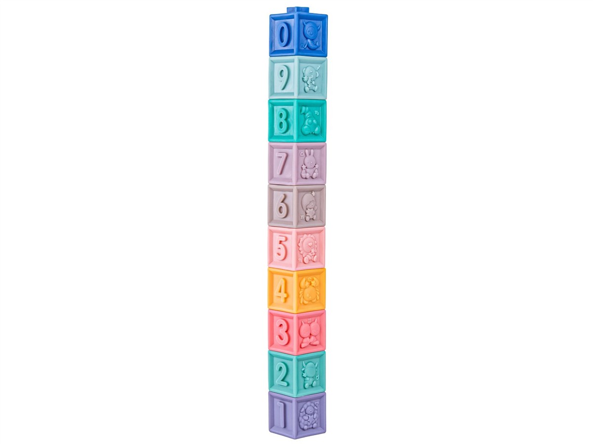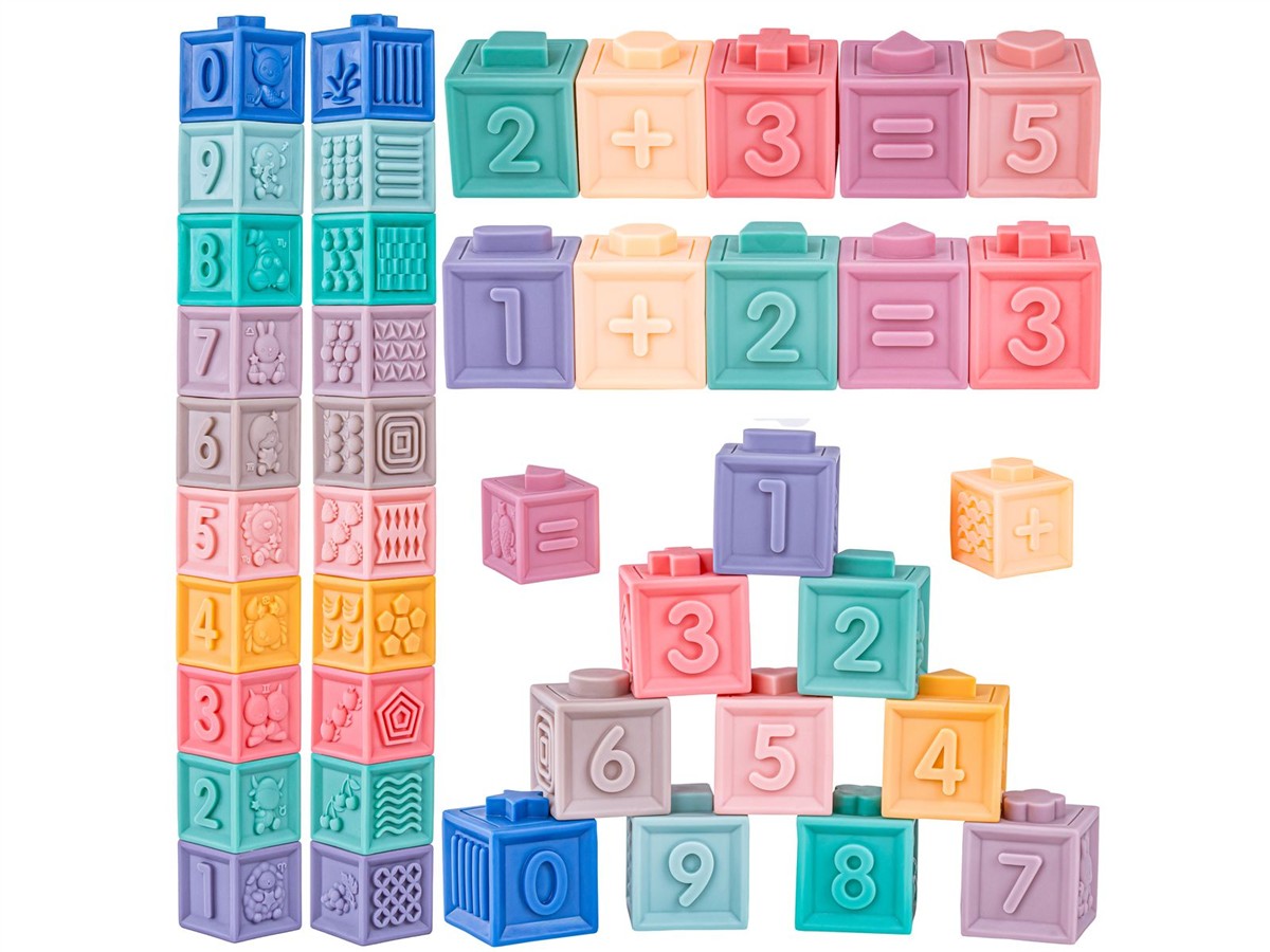 Niezwykle miękkie klocki zaciekawią każde dziecko. Klocki są gumowe i miłe w dotyku. Posiadają wypukłe elementy, dzięki czemu można je spasować w wieżę. Każdy z klocków posiada na ściankach cyferki, zwierzątka, owoce, kształty, figury geometryczne oraz znaki matematyczne. Dodatkowo zestaw wzbogacony został o klocki okrągłe, które należy spasować od największego do najmniejszego oraz kilka piłek o różnych fakturach i wypustkach. Całość jest odporna na wodę, dzięki czemu idealnie nadaje się do zabaw podczas kąpieli. W razie potrzeby klocki można bezpiecznie wyparzać w gorącej wodzie.
