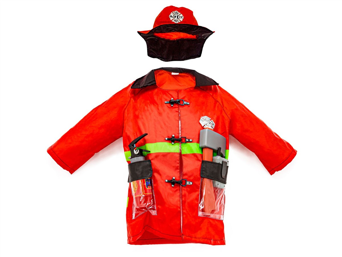 Aby nikt nie miał wątpliwości, że ma przed sobą najprawdziwszego, dzielnego strażaka, kostium i kask posiadają wspaniałą odznakę.