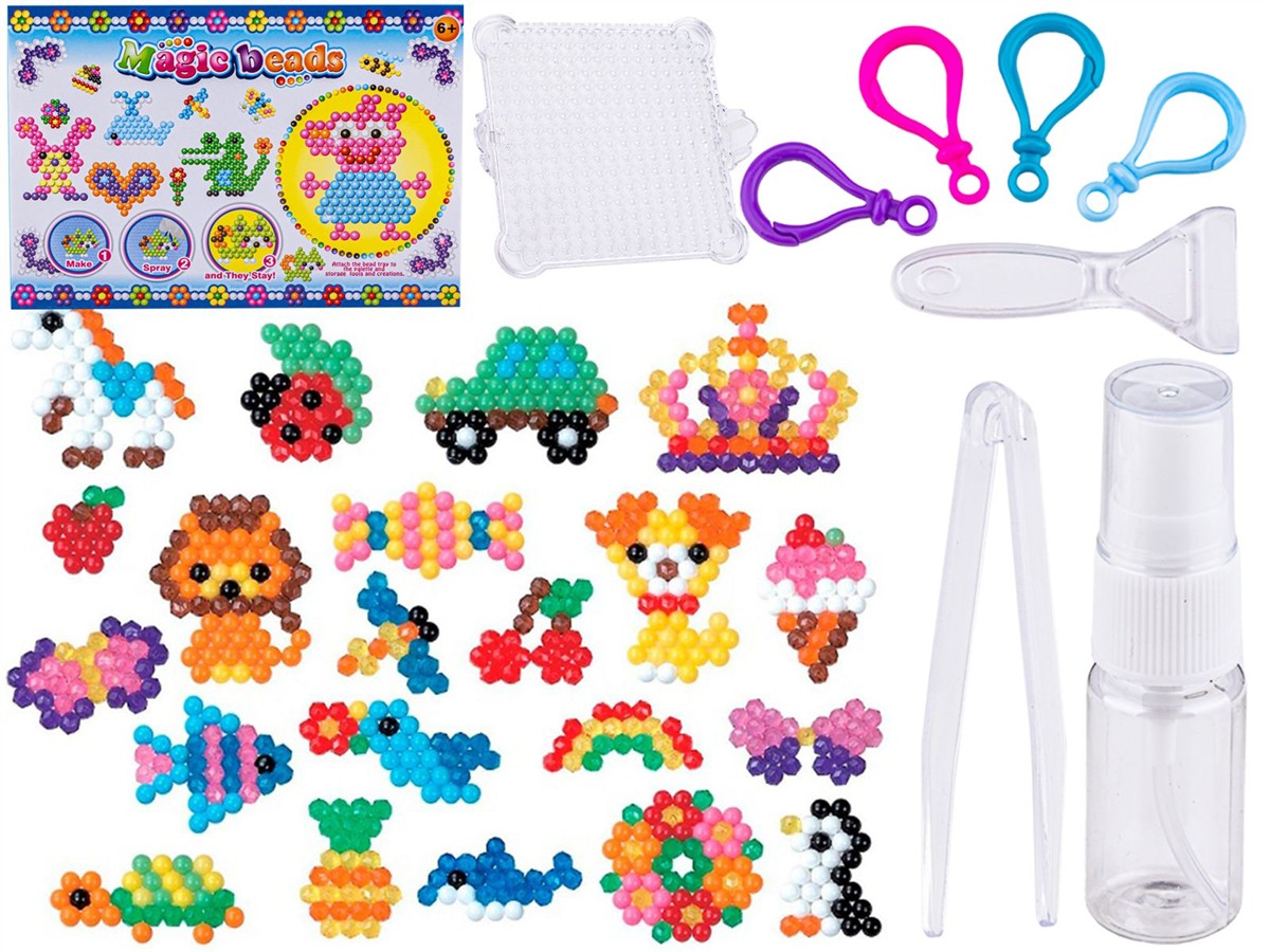 Koraliki wodne to kolorowe kuleczki, które można ze sobą dowolnie łączyć, tworząc coraz to nowe kształty, postacie, figury czy przedmioty. Koraliki zwiększają swoją przyczepność za pomocą odrobiny wody.