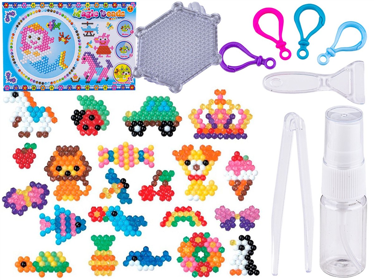 Koraliki wodne to kolorowe kuleczki, które można ze sobą dowolnie łączyć, tworząc coraz to nowe kształty, postacie, figury czy przedmioty. Koraliki zwiększają swoją przyczepność za pomocą odrobiny wody.