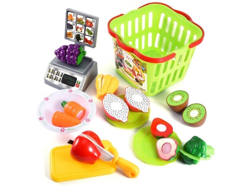 Po zakupach trzeba przyrządzić danie dla głodnych członków rodziny. Zestaw wyposażony został w deskę do krojenia oraz talerzyki. Dzieci mogą posiekać owoce i warzywa na pół. Produkty te składają się z dwóch elementów połączonych rzepem.