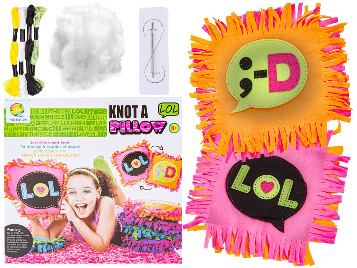 Zestaw składa się z kolorowych kawałków materiału, które należy ze sobą zszyć lub związać według instrukcji. Poszczególne elementy posiadają już wycięte otwory na igłę, dzięki czemu naszywanie ich na poduszkę to czysta przyjemność.