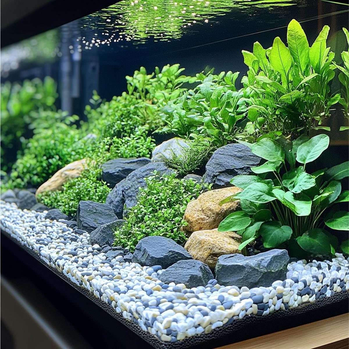 Naturalne, zaokrąglone kamyki w odcieniach szarości i błękitu doskonale komponują się z roślinami i tworzą harmonijne tło dla ryb.