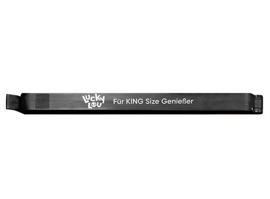 Plastikowy klips zamykający w kolorze czarnym i z białym logo Lucky Lou.