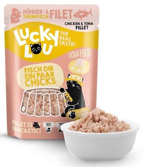 Lucky Lou Extrafood Tuńczyk i kurczak w galaretceKoty, lubią być rozpieszczane. Też lubisz od czasu do czasu prawdziwą ucztę, prawda? Dokładnie tak samo jest z kotami. Kochają dodatki! I dlatego do linii karm mokrych dodaliśmy Lucky Lou Extra Food. To…