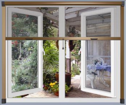 W tym rozwiązaniu stosujemy kasetkę z siatką montowaną poziomo - na górze wnęki okna. Moskitiera pracuje w pionie, góra - dół.
