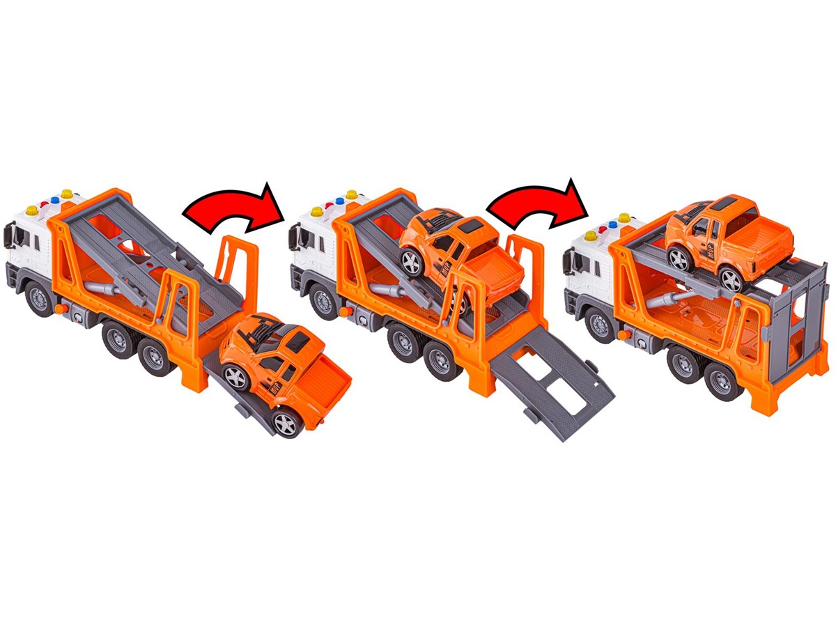 Wielofunkcyjna ciężarówka będzie świetnym prezentem dla małego fana motoryzacji. Konstrukcja tego pojazdu oraz dołączony do zestawu samochód sprawiają, że można je wykorzystać w zabawie na wiele różnych sposobów. Ciężarówka może pełnić funkcję pomocy drogowej, lawety czy transportera.