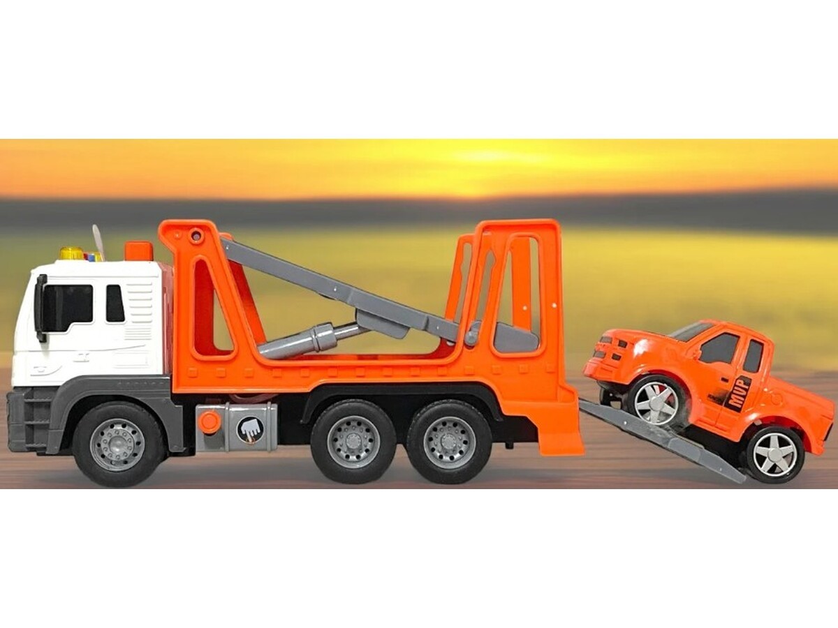 Laweta posiada ruchomy najazd, który możemy podnosić i opuszczać. W celu podniesienia należy naciskać pomarańczowy przycisk na dachu ciężarówki. Siłowniki automatycznie podniosą platformę. W celu jej opuszczenia wystarczy nacisnąć pomarańczową dźwignię umiejscowioną z boku pojazdu. To super zabawa!