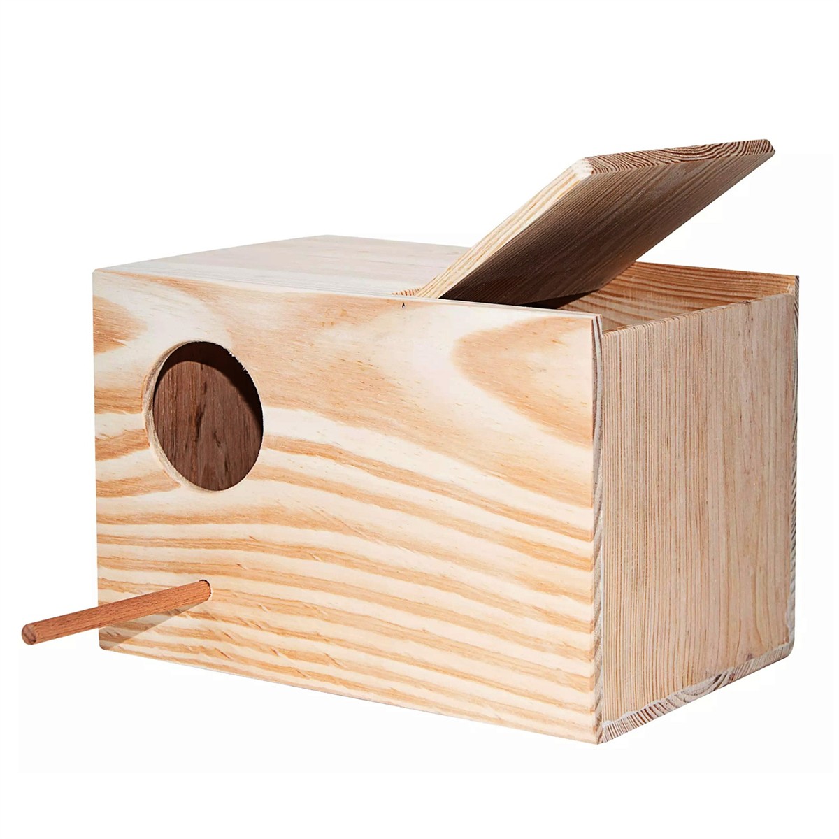 Drewniany domek lęgowy dla ptaków egzotycznych.