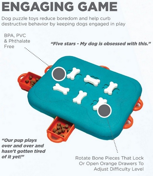 Węsząc i pomagając sobie łapą lub pyszczkiem pies natrafi na szufladki, które będzie musiał odblokować, zanim sięgnie po ukryte łakocie. System zamykania/otwierania polega na obróceniu kosteczki znajdującej się na wierzchu. Sprawdź czy Twój czworonóg jest geniuszem!