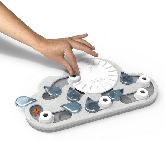 Gra edukacyjna Rainy Day zawiera 14 przegródek na smakołyki lub suchą karmę, które są blokowane poprzez przesuwny kołeczek oraz obrotową kroplę.