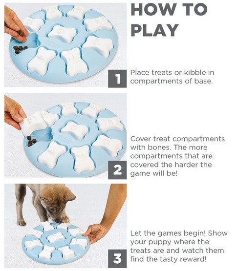 Ta interaktywna układanka zawiera 9 przegródek, które są zakryte wyjmowanymi kostkami. Połóż ulubione smakołyki swojego pupila w przegródkach i wedle uznania zakryj. Obserwuj jak twój pies uczy się kombinowania, aby odsłonić nagrodę!