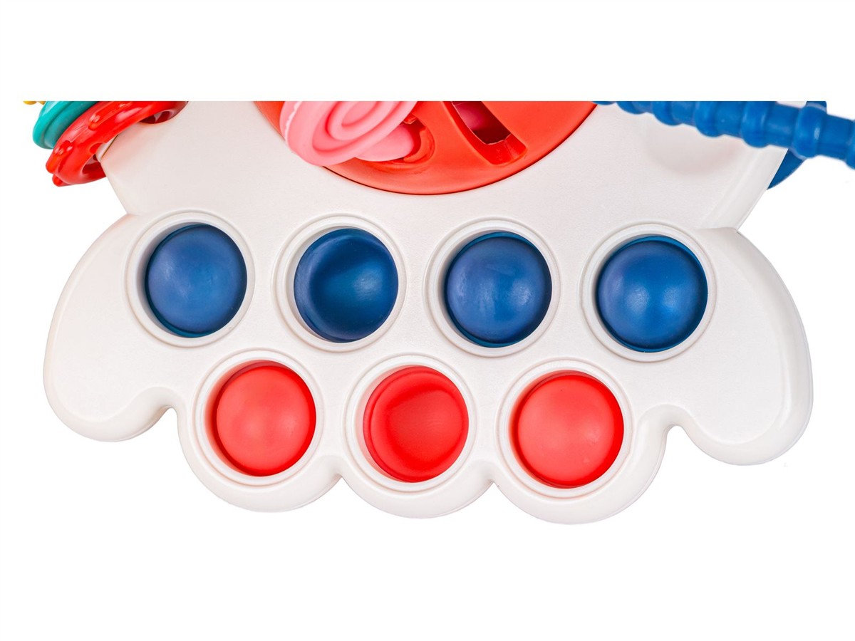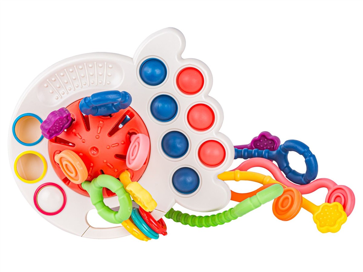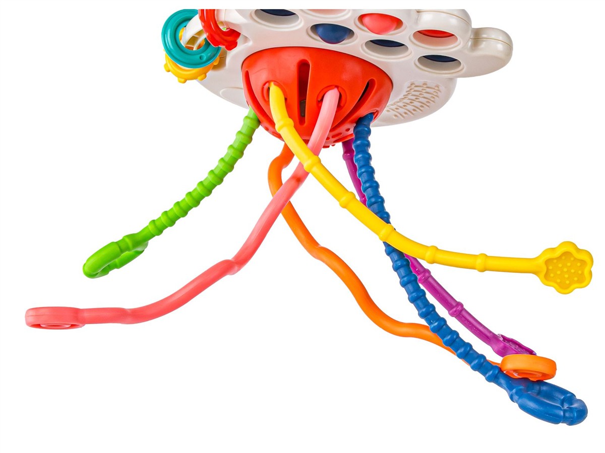 Grzechotka rozwija zdolności poznawcze dziecka oraz koordynację wzrokowo-ruchową dzięki przeciąganiu macek ośmiornicy przez specjalne otwory. Całość wykonana z najwyższej jakości, nietoksycznego i bezpiecznego dla dzieci materiału. Silikonowe sznurki stymulują zmysły dzieci dzięki oryginalnym kształtom i żywym kolorom.
