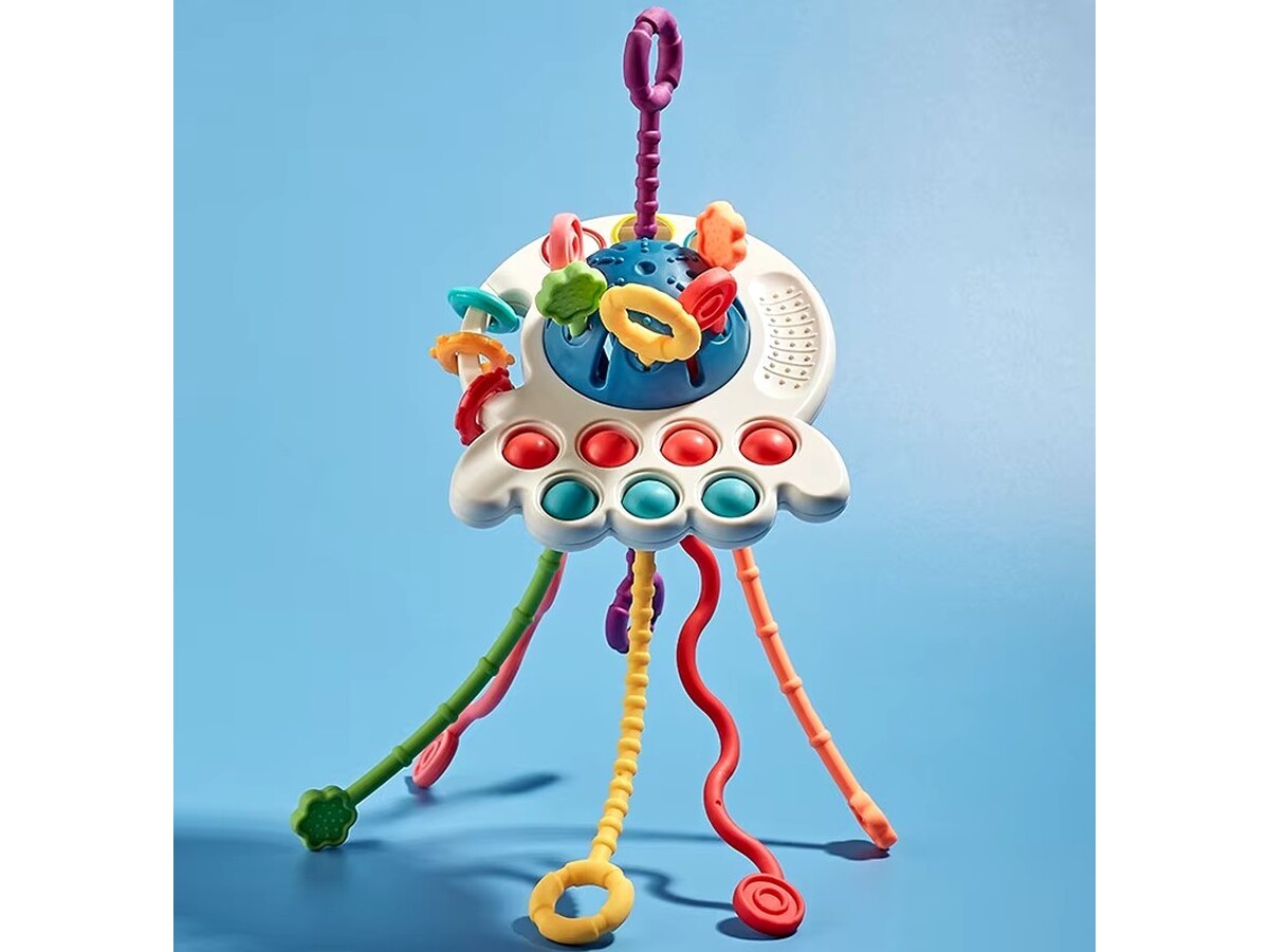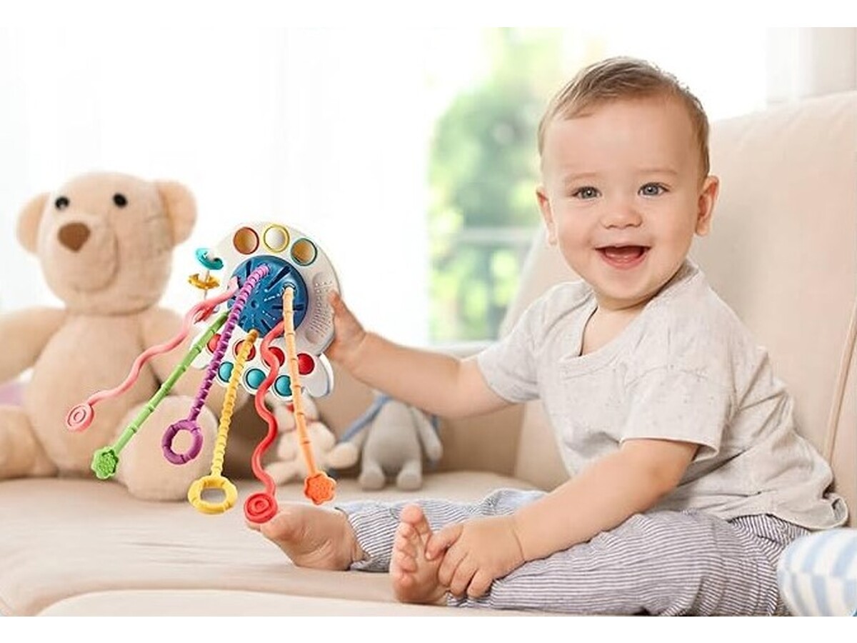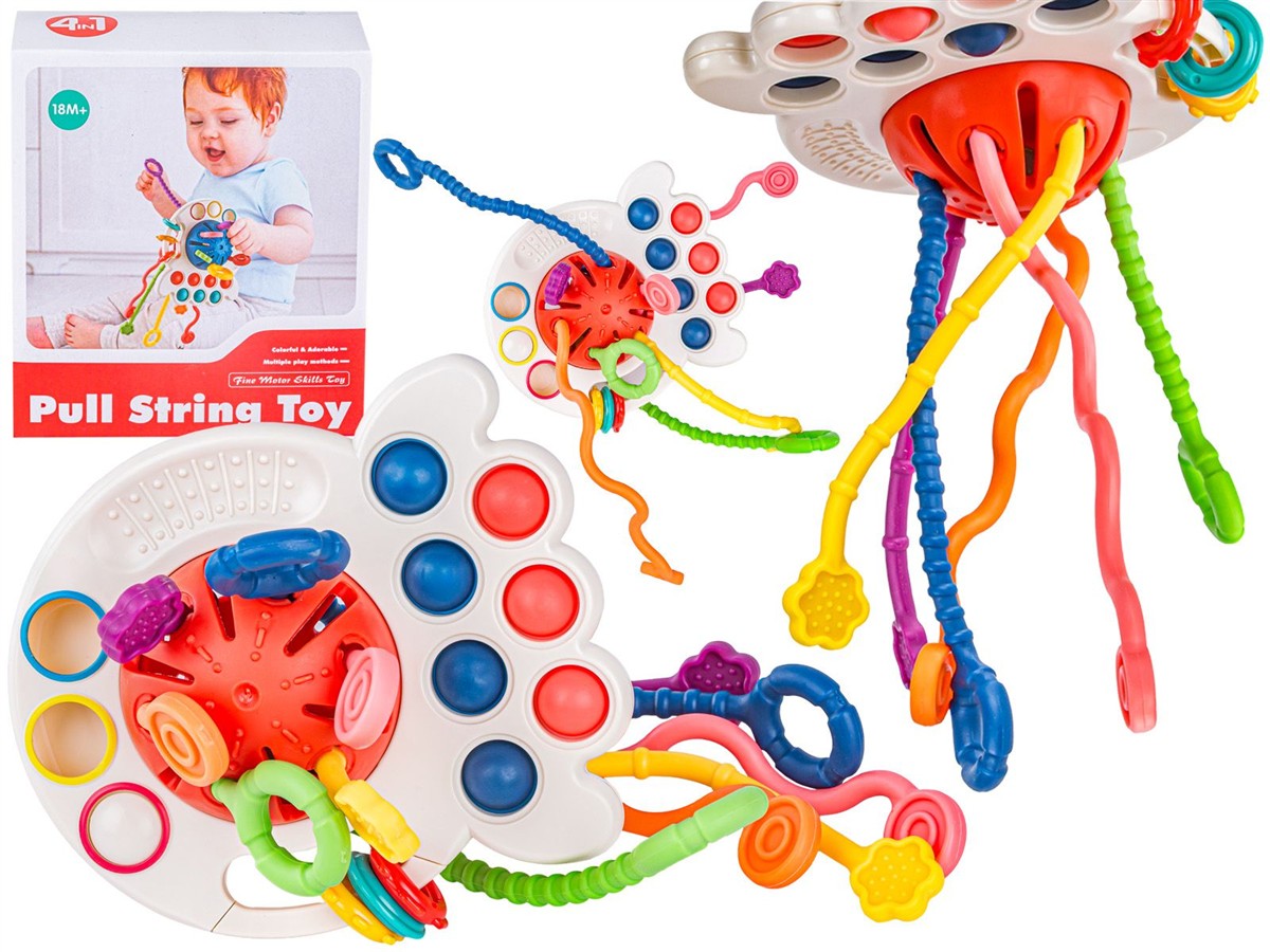 Grzechotka rozwija zdolności poznawcze dziecka oraz koordynację wzrokowo-ruchową dzięki przeciąganiu macek ośmiornicy przez specjalne otwory. Całość wykonana z najwyższej jakości, nietoksycznego i bezpiecznego dla dzieci materiału. Silikonowe sznurki stymulują zmysły dzieci dzięki oryginalnym kształtom i żywym kolorom.