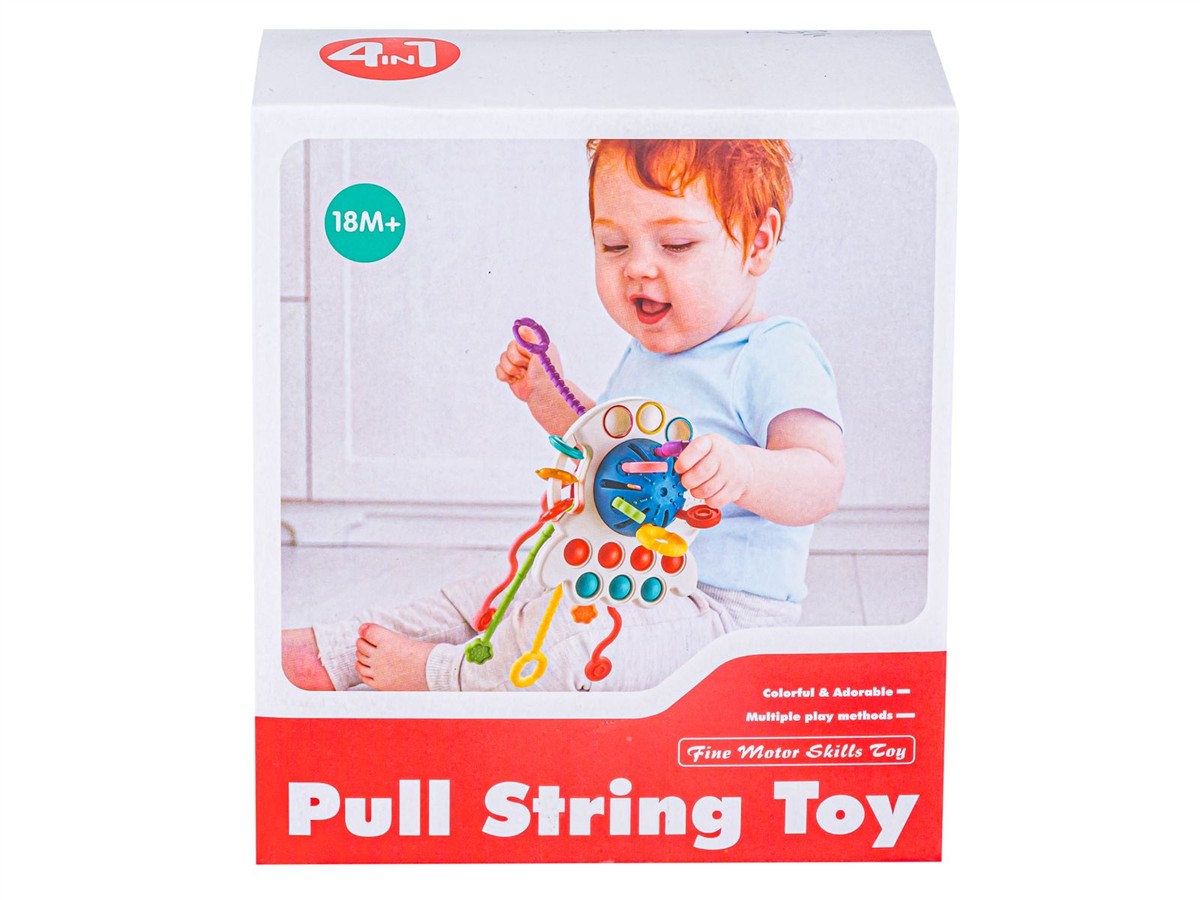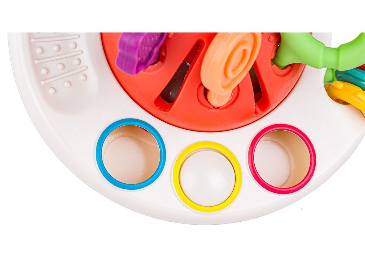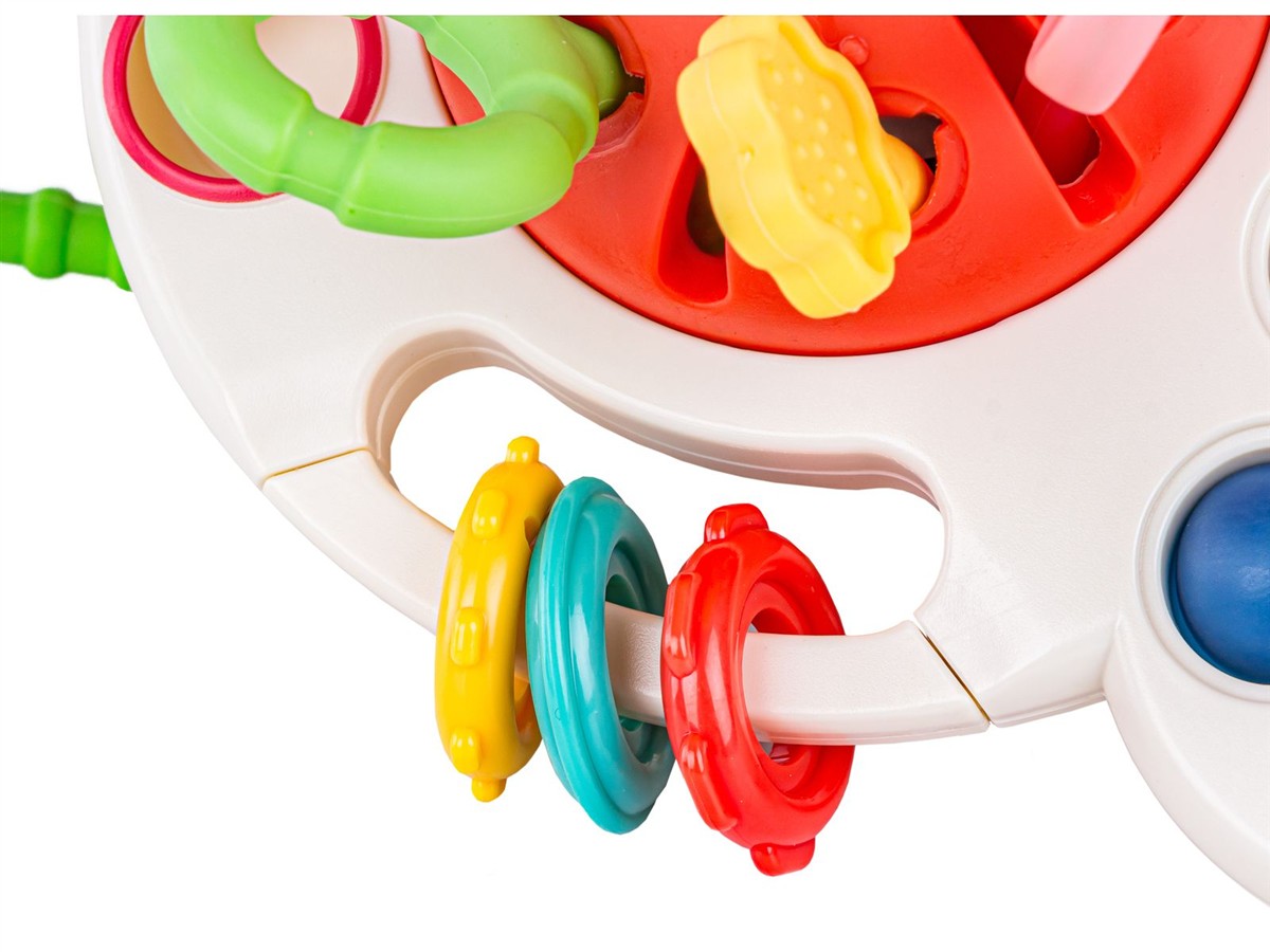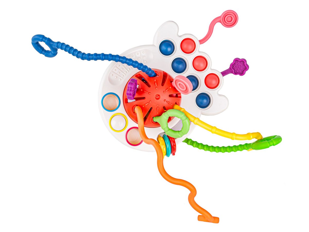 Dodatkowo dzięki różnorodnym zakończeniom kolorowych sznurków – zabawkę można powiesić lub zaczepić np. na wózku lub w aucie :)