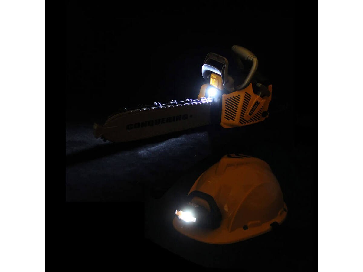 OświetlenieZarówno kask jak i sama piła posiadają dodatkowe oświetlenie. Piła posiada małą diodę nad łańcuchem natomiast kask latarkę. Latarka na kasku posiada regulację. Dzięki temu miejsce pracy jest dobrze doświetlone a zabawa jeszcze realniejsza i przyjemniejsza. | ![]() |