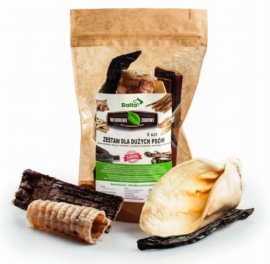 Balto Zestaw gryzaków na każdą kieszeńMając na uwadze portfele właścicieli psów, zebraliśmy w zestawie funkcjonalne gryzaki o stosunkowo niskiej cenie: stripsy wołowe (skóra z głowy wołowej-twarda i nieregularna), kopyta wołowe (można…