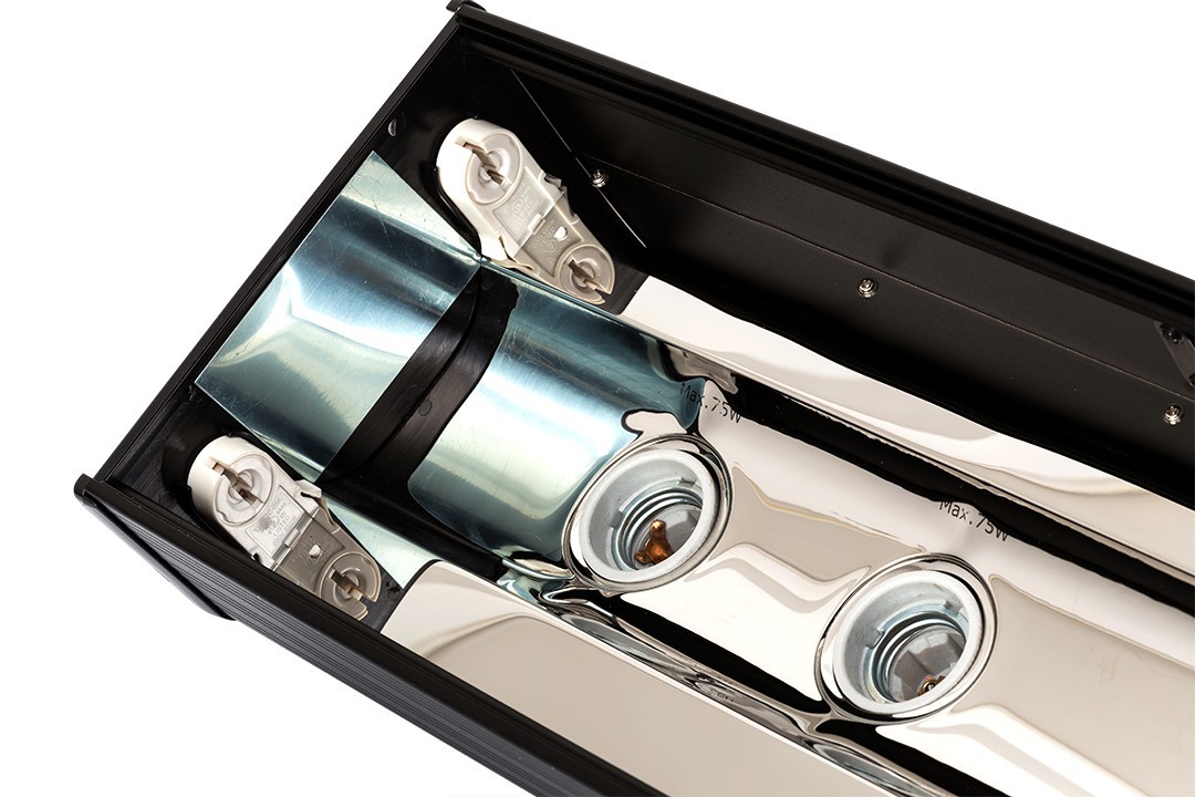 W belce znajdują się odbłyśniki wykonane z wysoko polerowanej stali nierdzewnej redukując straty oraz wzmacniając emisję promieniowania UV.