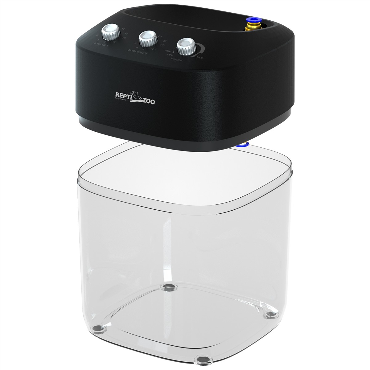 Automatyczny zraszacz terrarystyczny. Zapewni odpowiednią wilgotność w każdym terrarium tropikalnym poprzez zraszanie mikro mgiełką - deszczem. Posiada wbudowany komputer sterujący czasem zraszania, interwałami oraz intensywnością. Rozbudowane sterowanie i duży pojemnik na wodę gwarantują sukces w prowadzeniu terrarium tropikalnego.