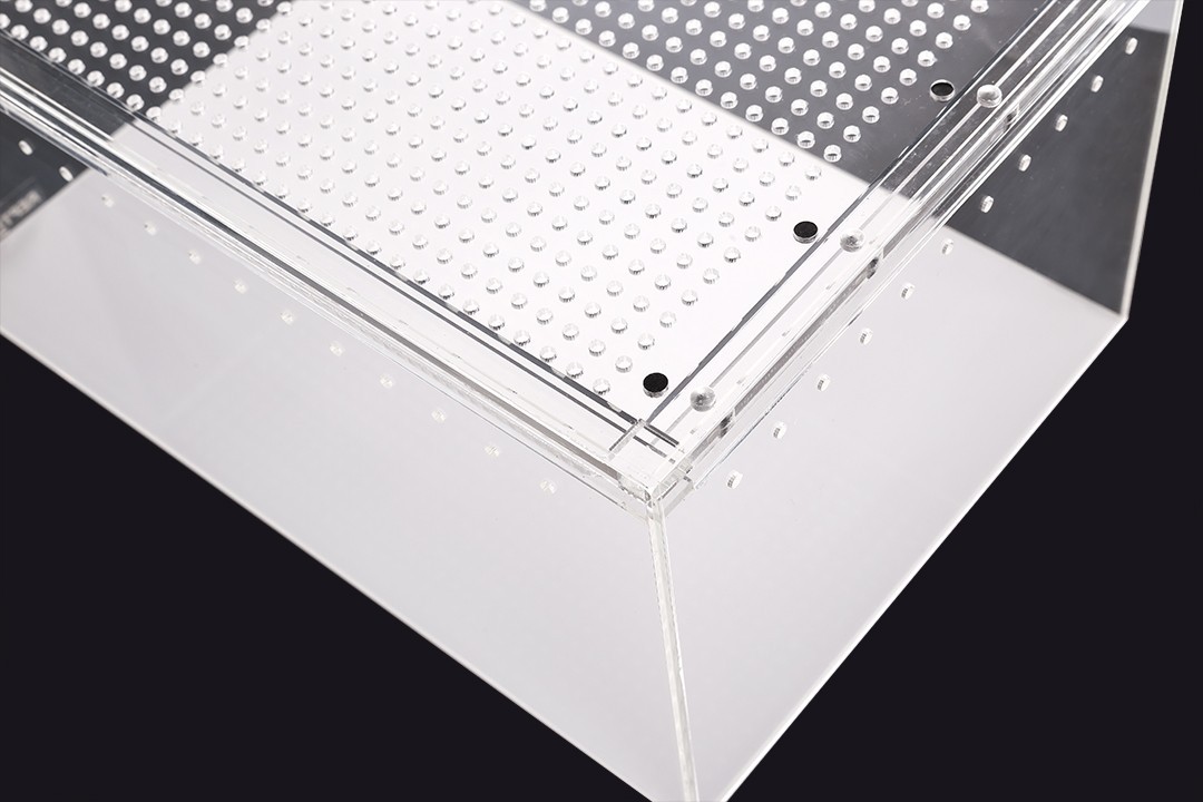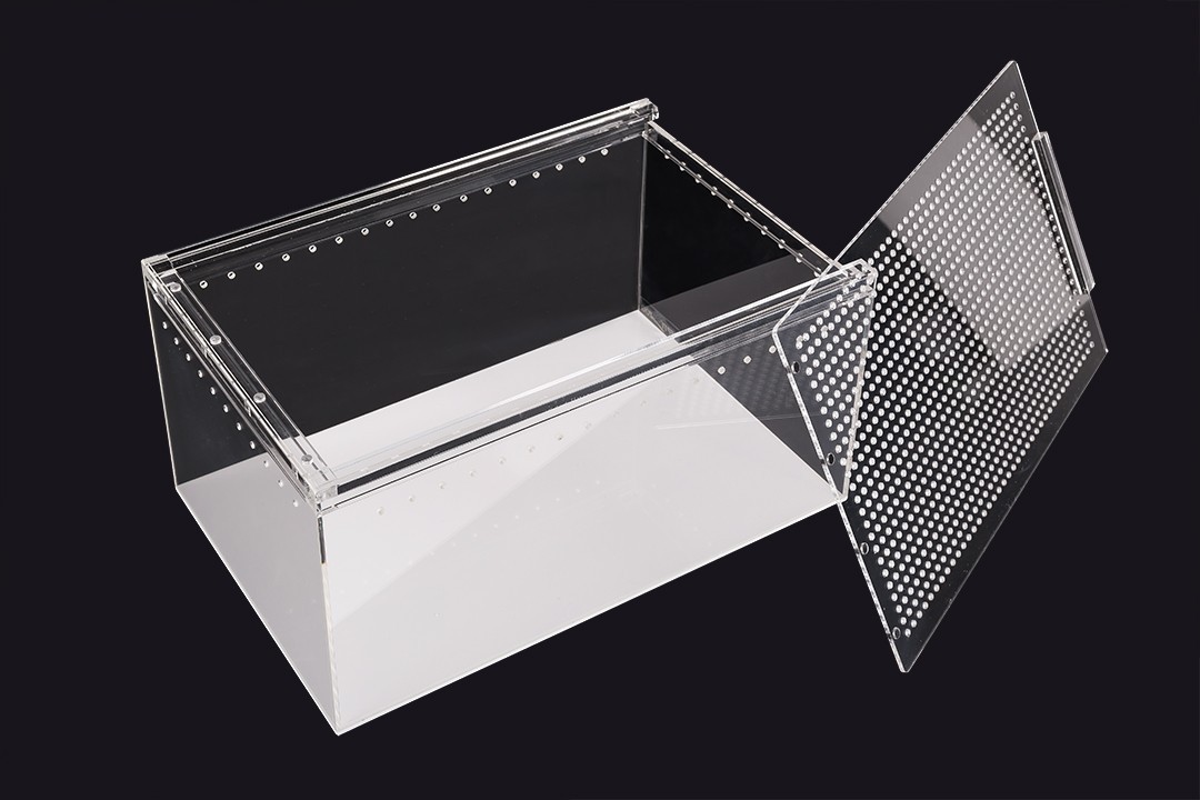 Terrarium wykonane z akrylu kryształowego cechuję się dużą lekkością i wygodną konstrukcją oraz doskonałą przejrzystością bez efektu załamywania się światła. Gładkie odporne na ścieranie ściany ułatwiają czyszczenie i zapobiegają osiadaniu się drobnoustrojów.