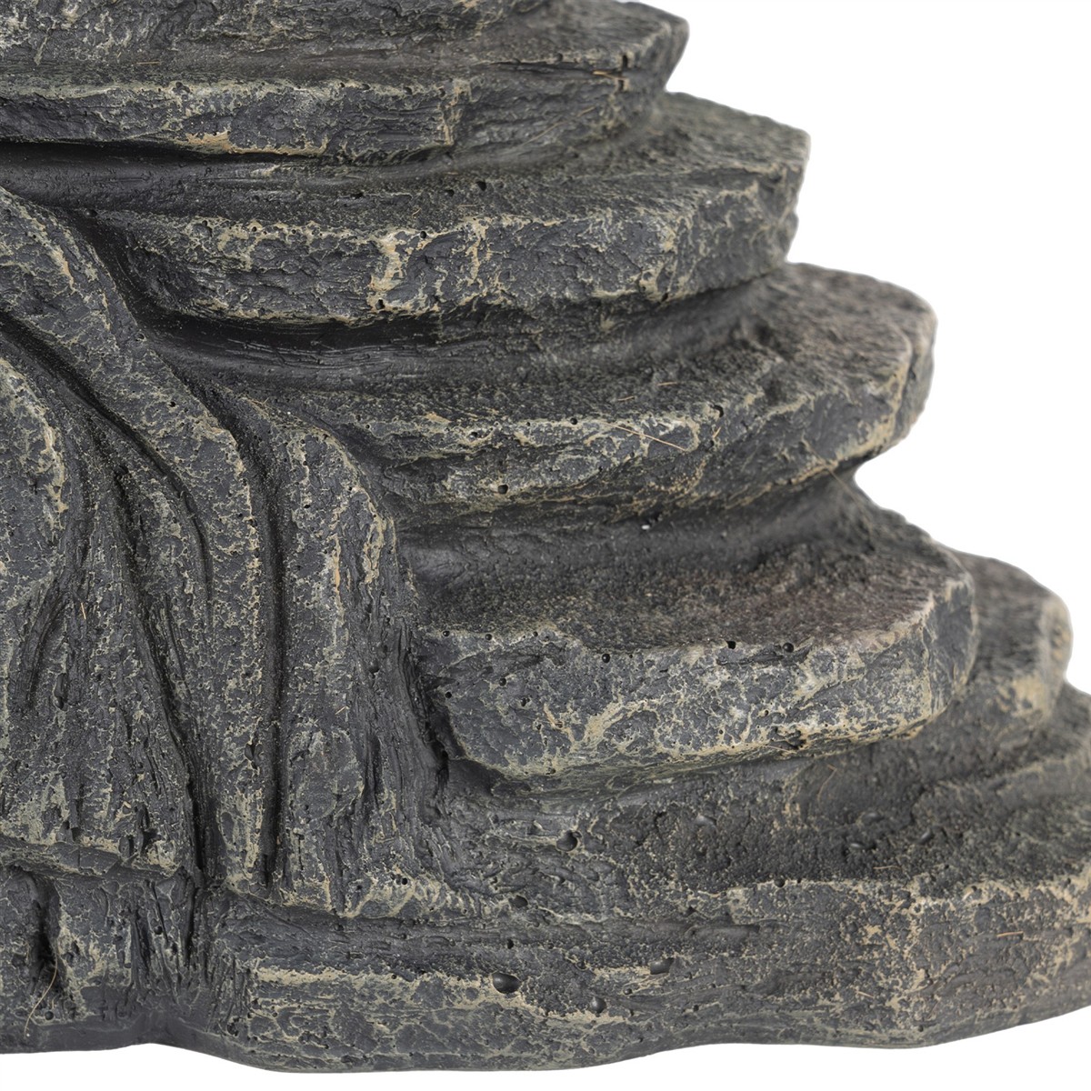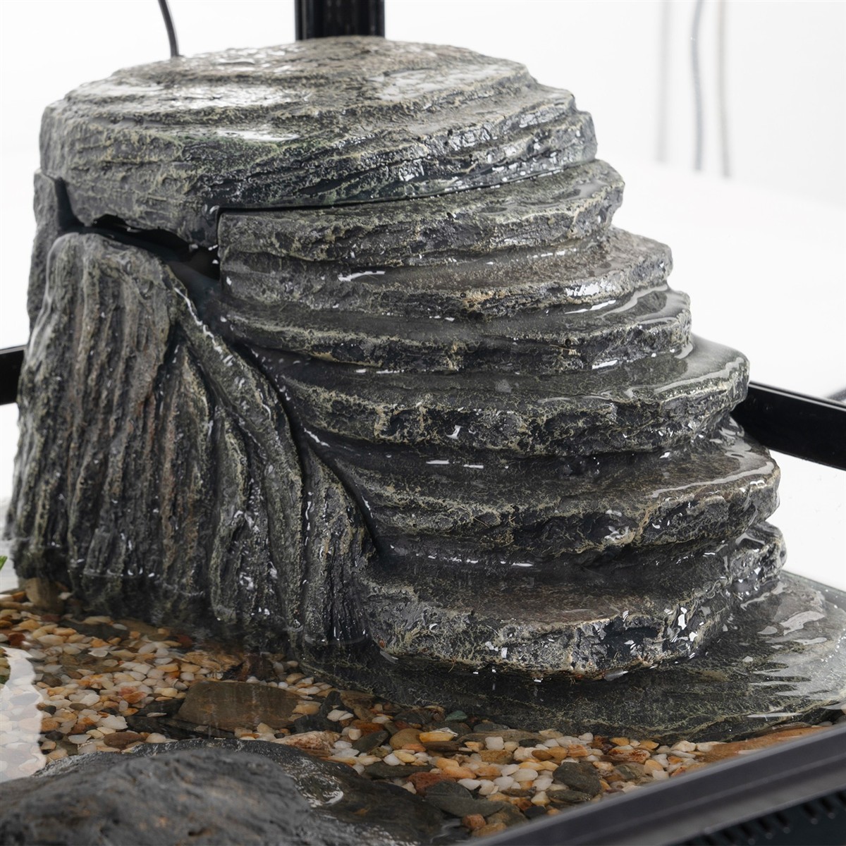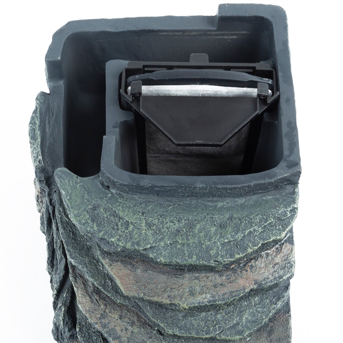 Na dole wyspy znajduje się pompa o wydajności 350 l/h ze wstępną gąbką zatrzymującą większe zanieczyszczenia. Następnie woda przechodzi przez górny filtr wieloetapowy: wkład z drobną włókniną mechaniczną, warstwę z węglem aktywnym (chemiczna filtracja) i sekcję biologiczną dla pożytecznych bakterii. Oczyszczona woda spływa elegancko wodospadem z góry wyspy, tworząc nie tylko spektakularny efekt wizualny, ale i stały obieg wody.