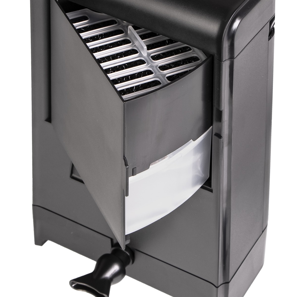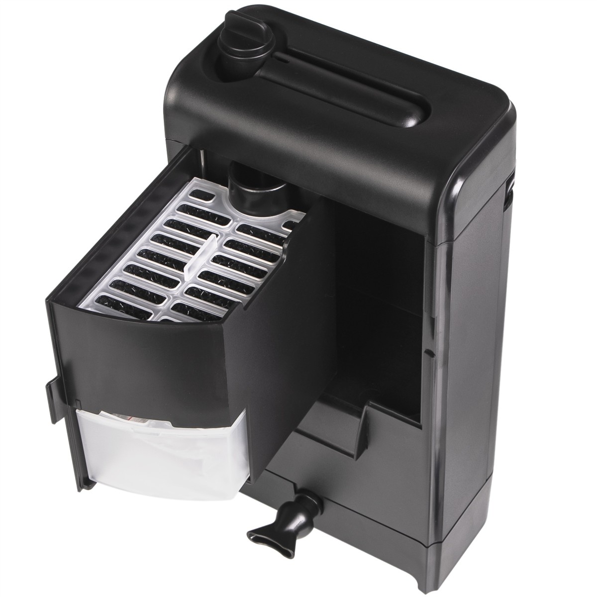 - Zaawansowany system filtracyjny: Woda przepływa przez dwie gąbki i aktywny węgiel umieszczone w oddzielnych koszykach, co zwiększa efektywność filtracji poprzez powolny przepływ.