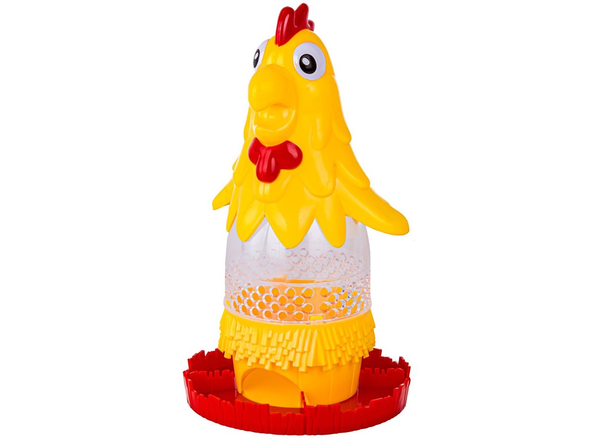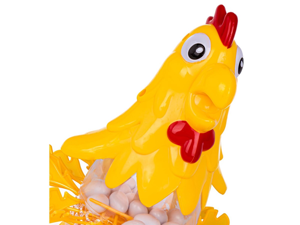 Umieść przezroczysty tułów na podstawie, następnie we wszystkie otwory powciskaj pióra kurczaka. Ostrożnie wsyp do środka jajka w taki sposób aby wszystkie zatrzymały się na piórkach. Następnie na tułów nałóż głowę kurczaka. Zestaw jest już gotowy do zabawy.