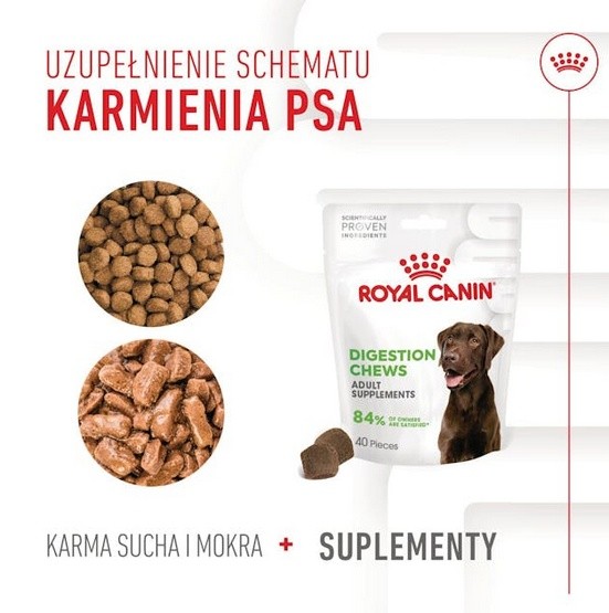 Receptura ROYAL CANIN® Digestion Adult Dog Chews została opracowana tak, aby wspierać zdrowie przewodu pokarmowego psa. Dodatek prebiotyków wpływa korzystnie na równowagę mikrobioty jelitowej a beta-glukany (postbiotyki) sprzyjają prawidłowemu trawieniu i odpowiedniej jakości kału.