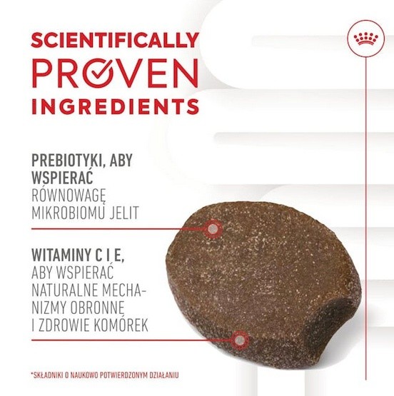 Receptura ROYAL CANIN Immunity & Digestion Puppy Chew zawiera witaminy C i E, które wspomagają naturalne mechanizmy obronne i zdrowie szczeniąt. Dodatek prebiotyków wpływa korzystnie na równowagę mikrobioty jelitowej a beta-glukany (postbiotyki) sprzyjają prawidłowemu trawieniu i odpowiedniej jakości kału.