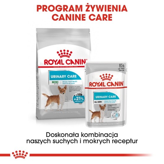 Karma ROYAL CANIN® Urinary Care Mini jest przeznaczona dla psów z wrażliwym układem moczowym, o masie ciała do 10 kg. Receptura karmy sprzyja zwiększeniu pobrania wody przez psa, co daje podwójną korzyść. Po pierwsze powoduje częstsze oddawanie moczu, a ponadto rozcieńcza mocz, co stwarza w pęcherzu moczowym środowisko niesprzyjające wytrącaniu kryształów i hamuje powstawanie kamieni moczowych.