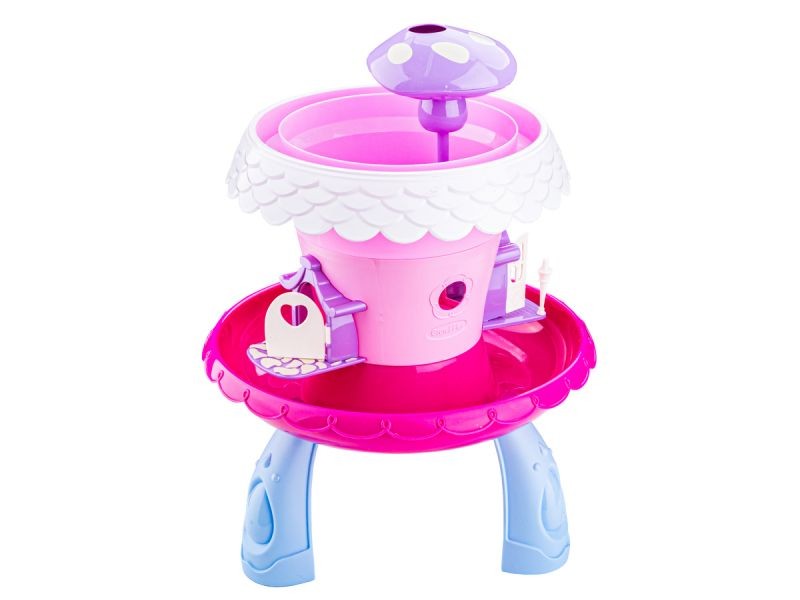 Na górze zabawki umieszczony został grzybek, który doskonale nawodni nasze roślinki. Wystarczy wlać do niego wodę aby zobaczyć prawdziwą fontannę. Zakończenie / obramówka górnej doniczki to tunel, do którego po wlaniu wody zobaczymy podobny efekt. Woda ścieknie na dół 4 otworkami i nawodni niższy poziom.