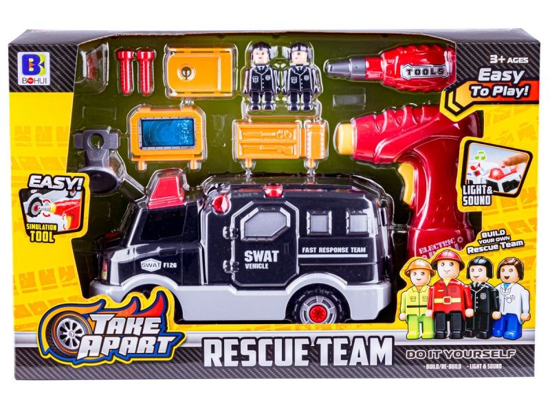 Rozkręcany pojazd operacyjnej jednostki SWAT to idealna zabawka dla małych majsterkowiczów. Zestaw ten rozwija kreatywność, logiczne myślenie i zdolności manualne. W skład zestawu wchodzi mnóstwo części, m.in. koła, karoseria, śruby.