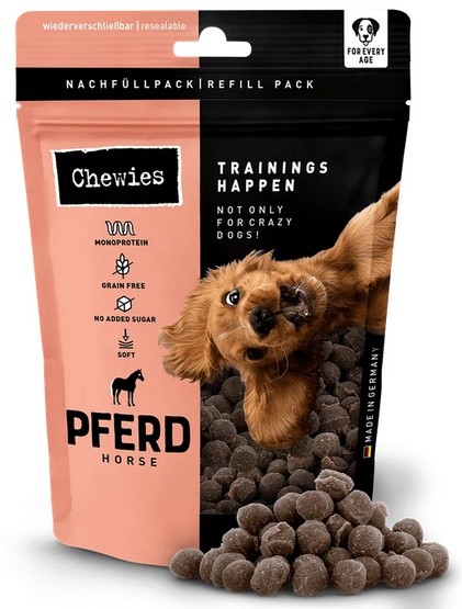 Chewies Trainings-Happen to wyjątkowo smaczna przekąska-nagroda dla psów z wrażliwym żołądkiem lub alergiami.Konina to jedyne źródło białka zwierzęcego, które razem z ziemniakami, marchewką, jabłkami, wieloma ziołami, olejami i minerałami…