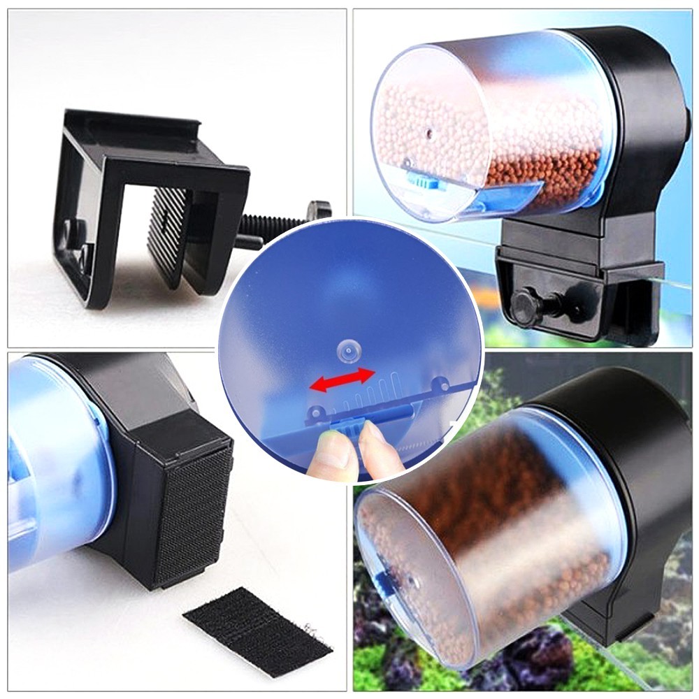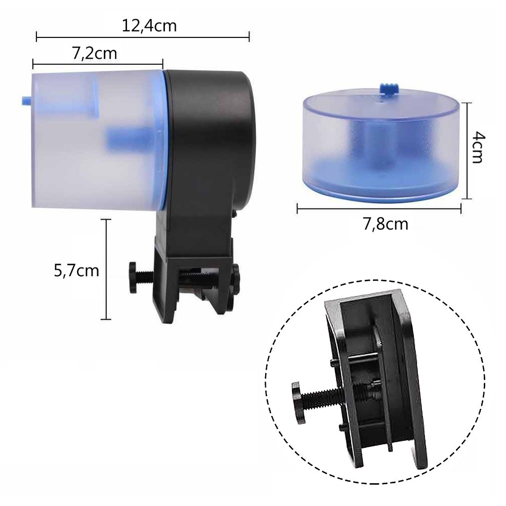 W zestawie znajdziemy podstawkę umożliwiającą postawienie karmnika na pokrywie akwarium. Zsyp w kształcie lejka, zapewnia przesypanie się całości pokarmu do otworu w pokrywie, bez rozsypywanie go na boki.
