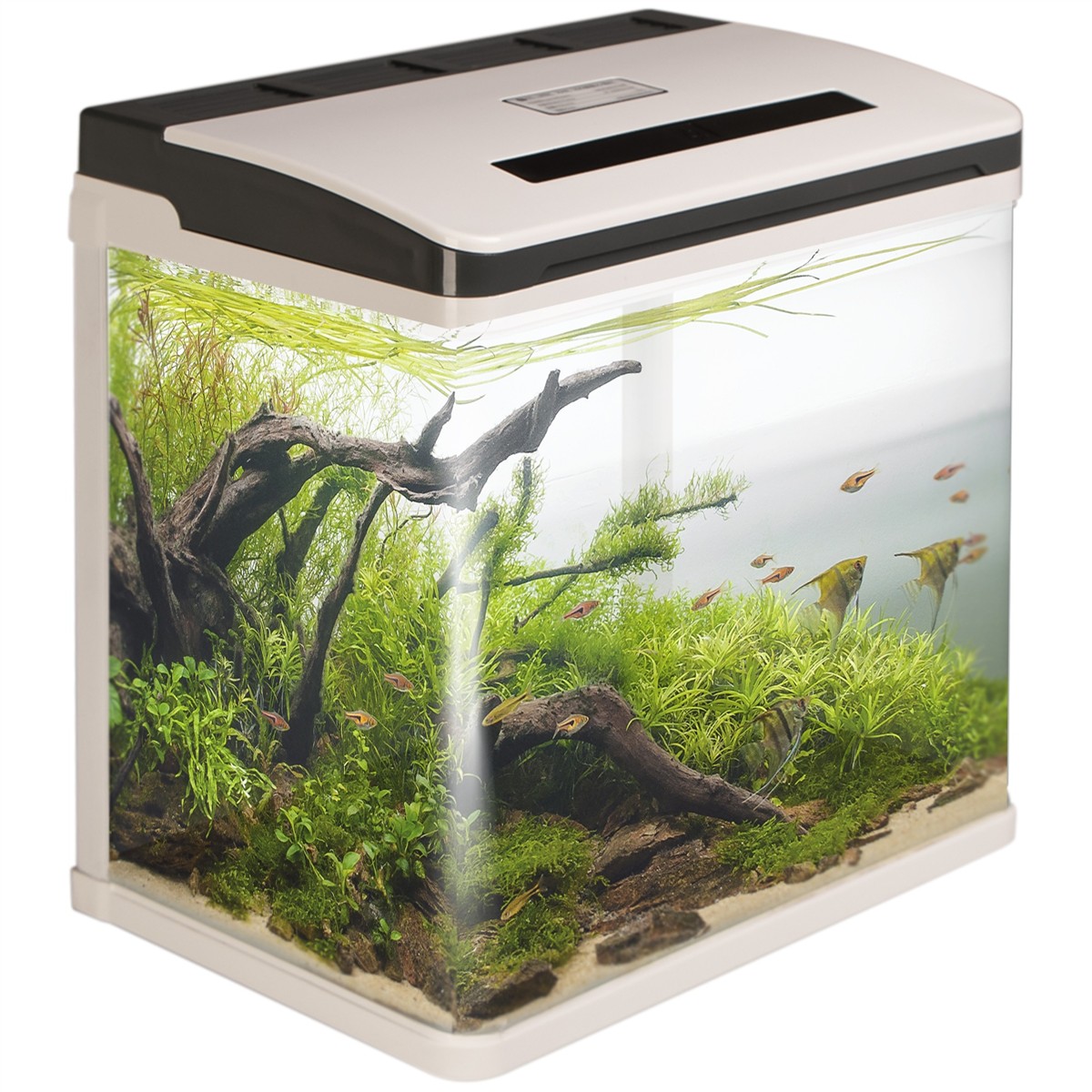 Na pokrywie znajduje się dotykowy panel, odpowiadający za elektroniczne sterowanie oświetleniem. Można uruchomić oświetlenie nocne / dekoracyjne które zmienia swą barwę poprzez wszystkie kolory światła RGB. Zmieniające barwy oświetlenie, z pewnością przypadnie do gustu młodym akwarystom oraz nada zbiornikowi unikalny charakter.