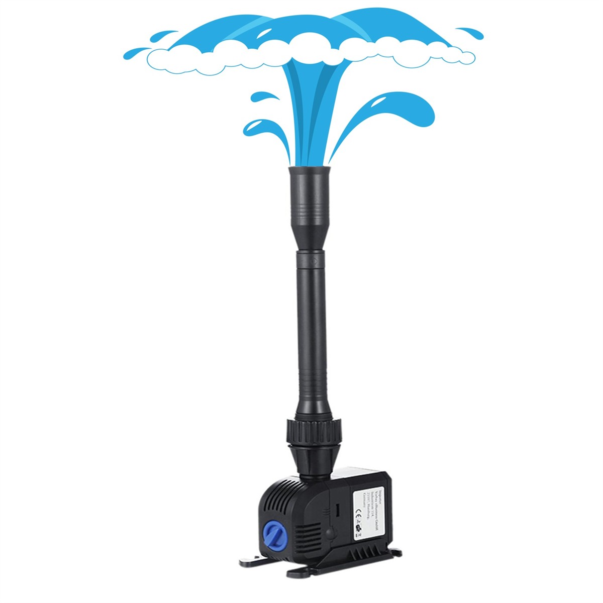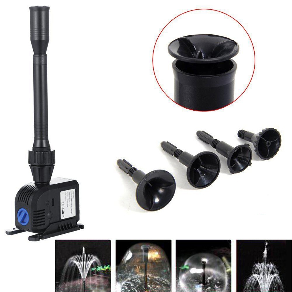 W zestawie znajduję się zestaw dysz wylotowych o różnych konfiguracjach ustawień wylotu wody. Komplet umożliwia szybkie stworzenie pięknej fontanny w każdym zbiorniku wodnym.